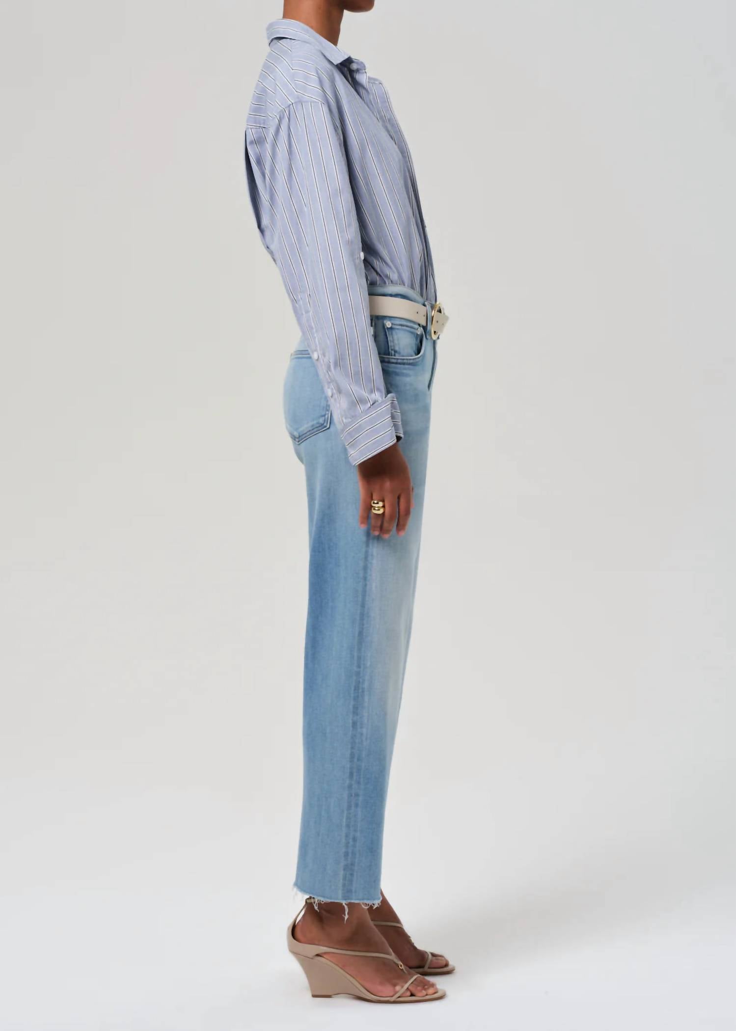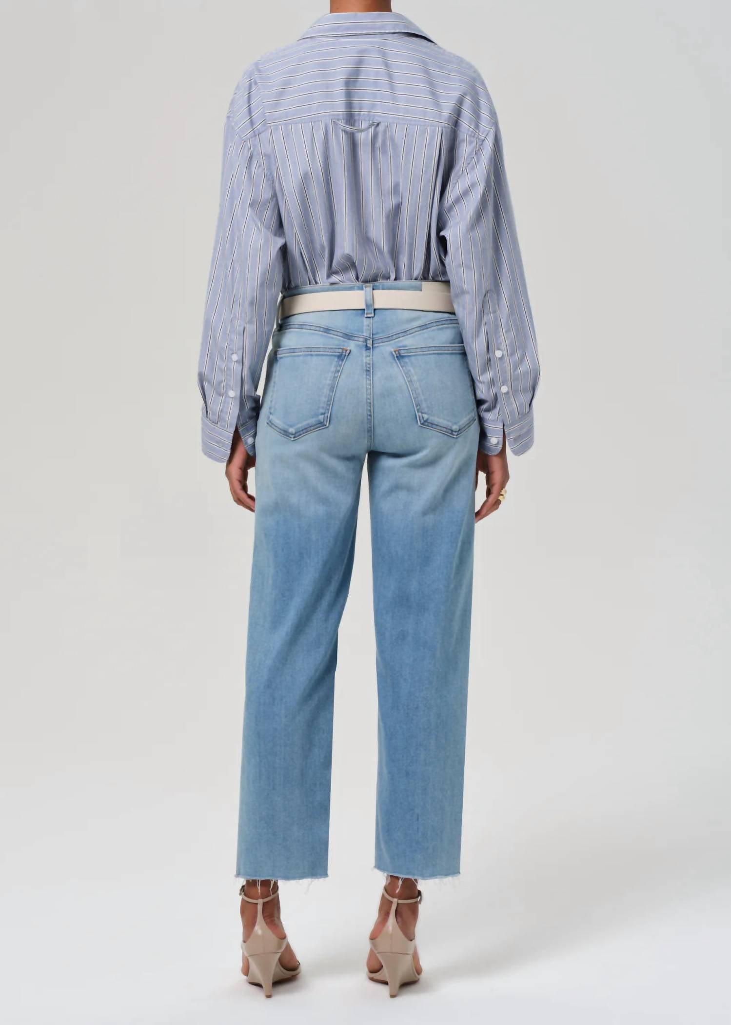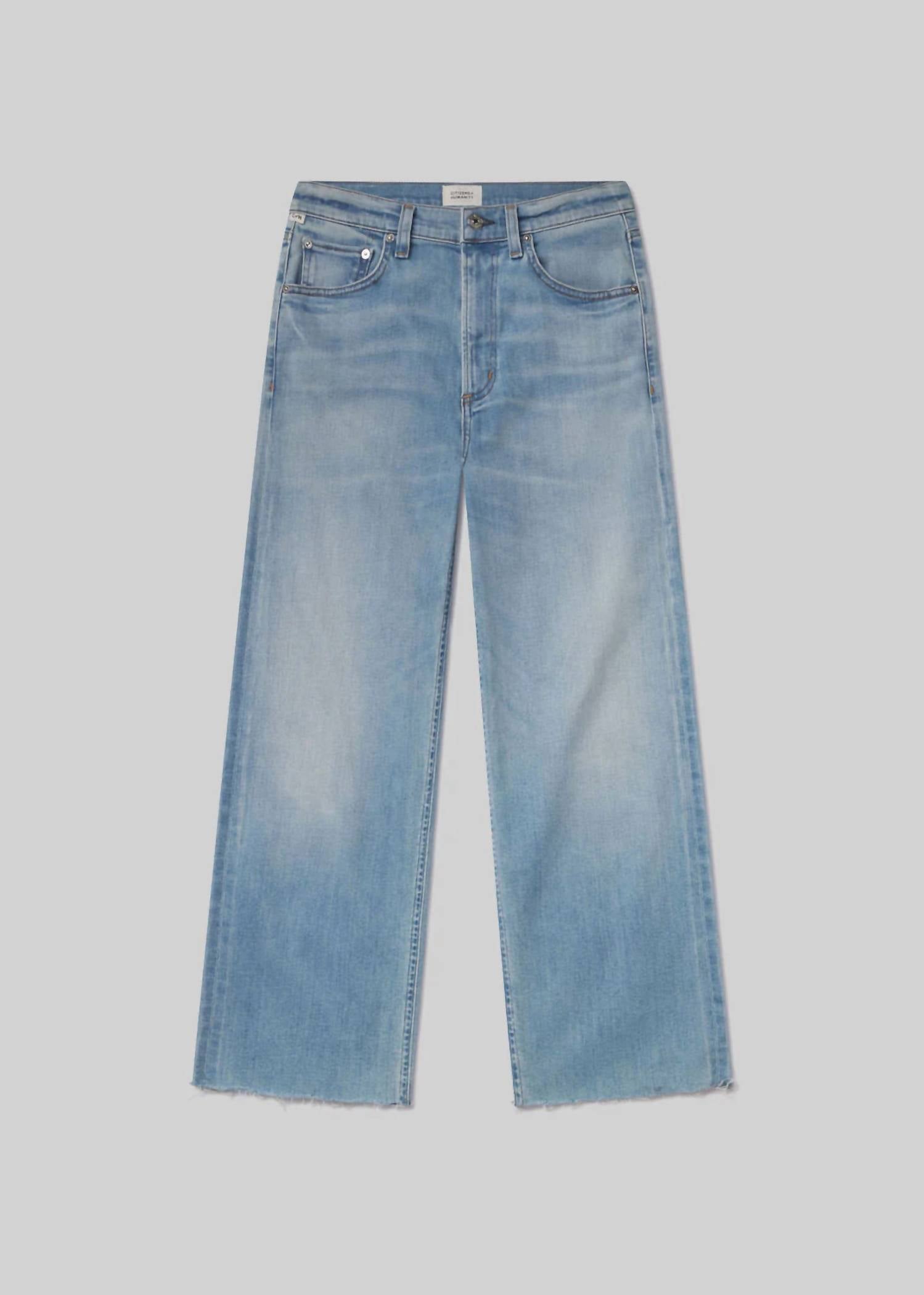 Fit to perfection, we love these high-waist jeans and you will too. Introducing the Palma Straight Jean by Citizens of Humanity in the Lisbon colorway, part of the Soft Stretch collection for women. These classic high-rise jeans feature a relaxed fit with an 11" rise and a 27" inseam, complemented by a straight leg style. Crafted from a blend of 81% Regenerative Cotton, 11% Lyocell, 6% Elastomultister, and 2% Elastane, they offer a light wash with subtle fading for a timeless look. Closure is via a zip fly; care includes machine washing cold inside out and tumble drying on low. Made in Turkey with imported materials, these jeans are perfect for church or casual workwear.