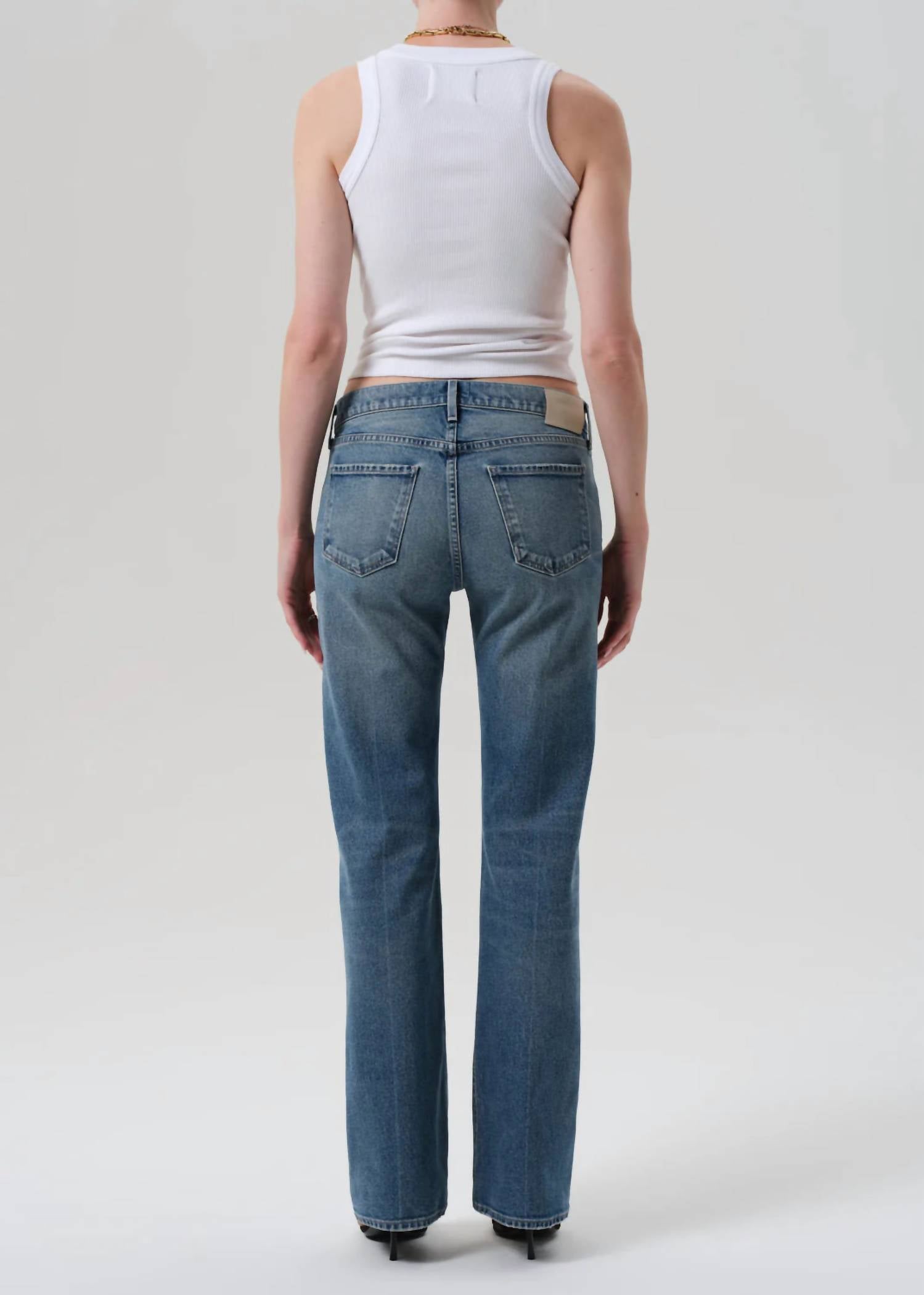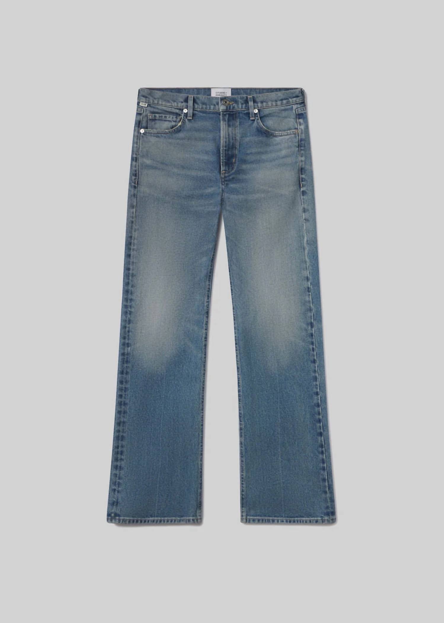 Experience timeless style with the Women's Genova Low Rise Bootcut Clairo Jeans by Citizens of Humanity, perfect for any vacation or summer outing. Expertly crafted from Japanese comfort stretch denim, these classic fit, full-length jeans feature a flattering bootcut leg with a 32-inch inseam. The medium wash in blue, with subtle fading and whiskering, enhances their lived-in, textured appearance. Closure is a secure zip, accompanied by functional pockets, making them both stylish and practical.