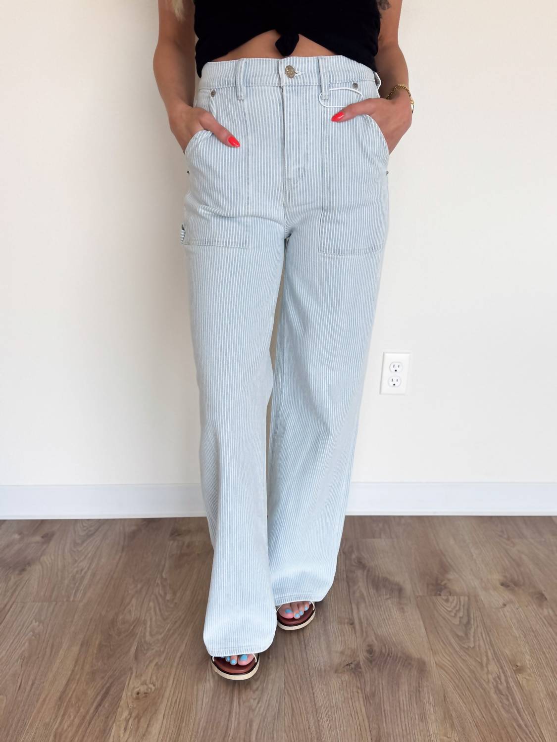 Elevate your denim collection with these Zaria Wide Leg Pinstripe Jeans from DAZE. The high-waisted silhouette flatters your figure while the light blue fabric with white pinstripes adds a sophisticated touch to casual outfits. Featuring Comfort Stretch technology, these jeans move with you throughout the day, ensuring you never have to choose between style and comfort. 98% Cotton, 2% Spandex