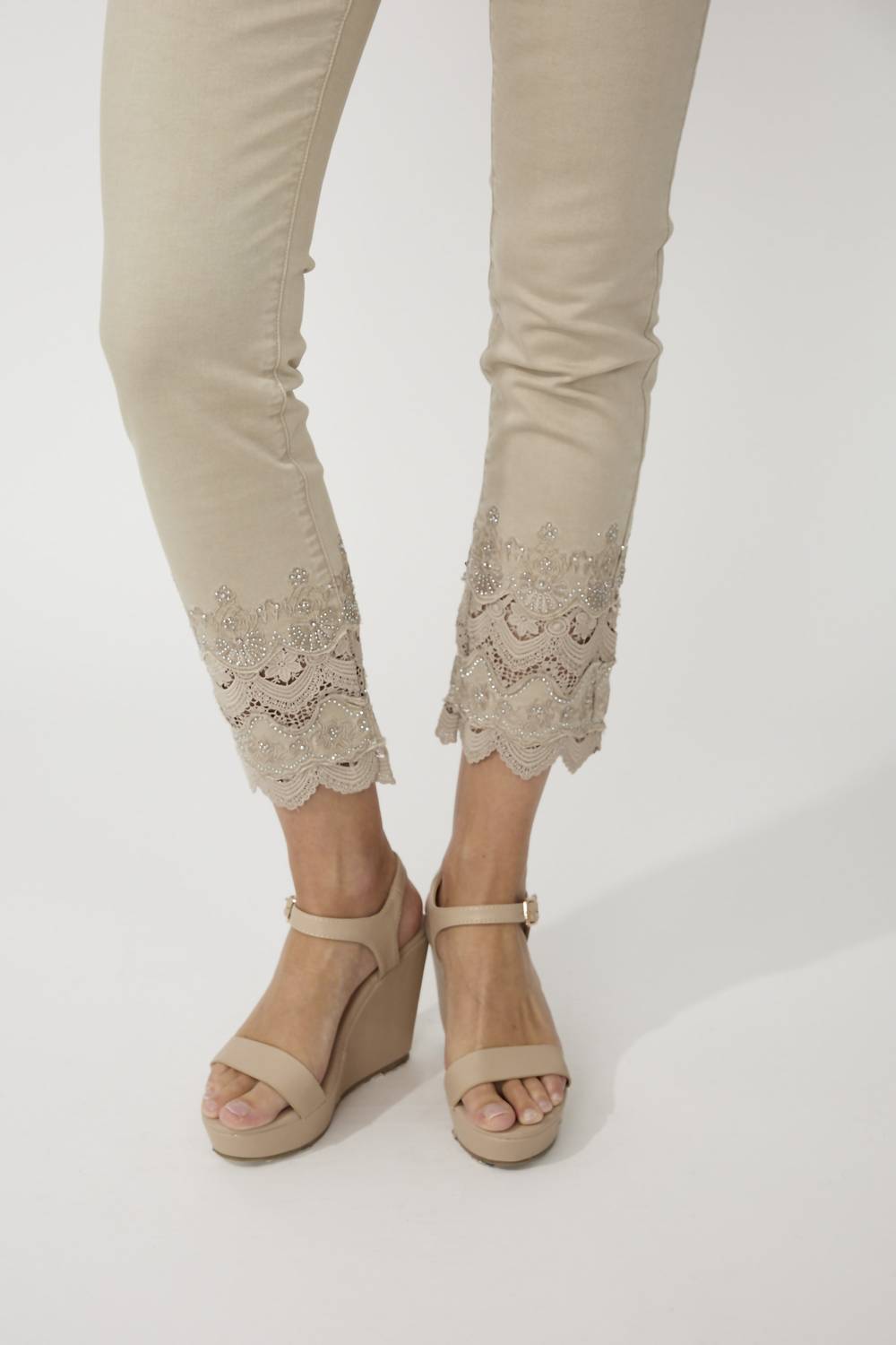 Discover the Frank Lyman Slim Ankle-length Jeans, crafted for style and comfort with a flattering mid-rise waist and ankle-length cut. Made from a cotton blend featuring 98% cotton and 2% elastane, these tan trousers offer a slim fit and versatile elegance with their plain pattern and intricate embroidery with buttons. Equipped with both front and back pockets and a convenient zip closure, these jeans are perfect for casual and semi-formal occasions. Care instructions advise hand washing to maintain their quality and appeal, with an approximate inseam length of 28" (71 cm) for size 12.