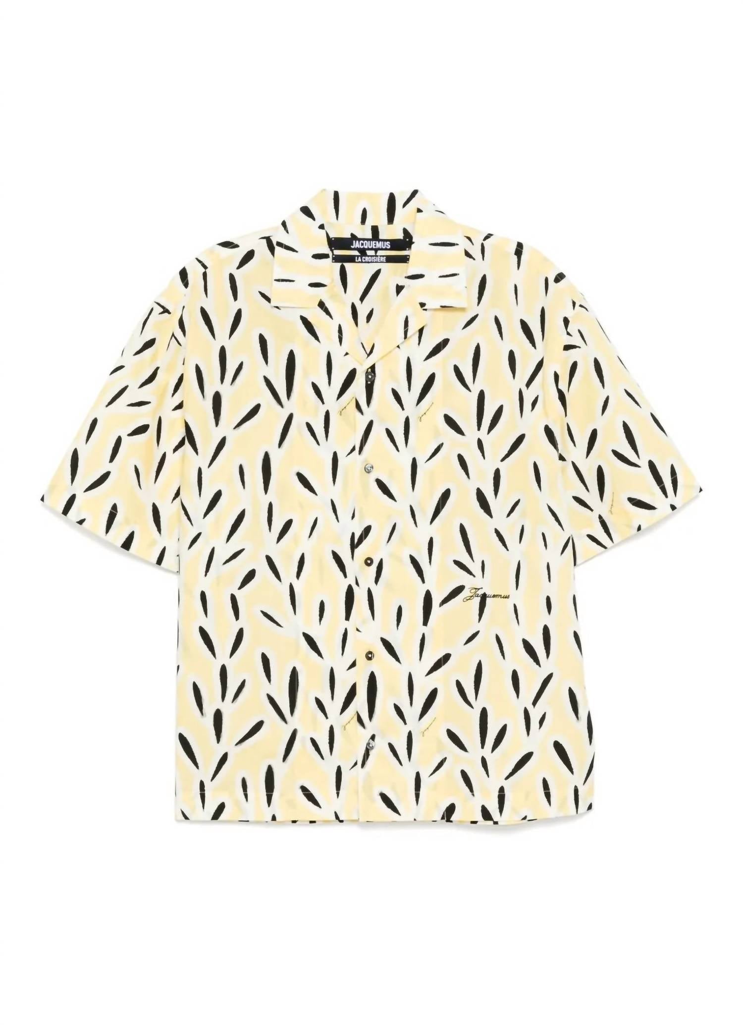 Introducing La Chemise Jean by Jacquemus, a stylish short-sleeved shirt in vibrant print yellow and black that's perfect for summer. Crafted from 100% Cotton, this oversized fit shirt features a camp collar, short elbow-length sleeves, and a unique 50’s embroidered logo. It is made in France and includes a back yoke with a "J" locker loop and luxurious mother-of-pearl buttons. Closure: Button closure.