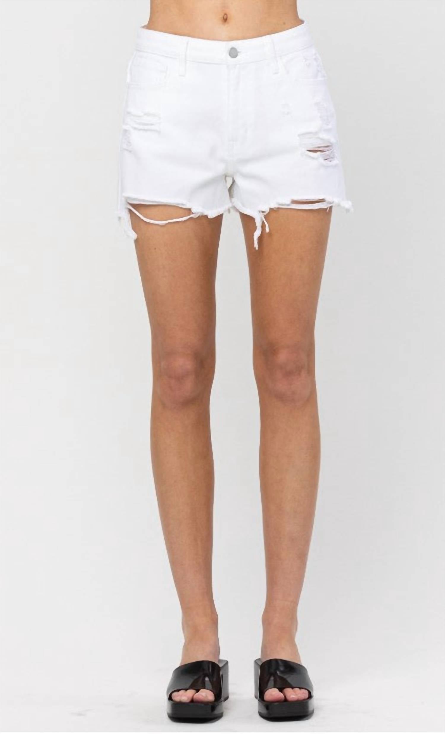 Tuck your favorite tee into these high-waist shorts for a more casual-cool feel. Elevate your summer wardrobe with the Jackson Denim Shorts by Jelly Jeans, designed for women seeking style and sophistication. These high-waisted, solid white shorts boast a trendy distressed cut-off silhouette and a practical 3-inch inseam for coverage. Crafted from 100% cotton, they feature handy pockets and a secure button closure. Easy to care for with machine wash instructions, these shorts are an ideal choice for summer vacations and seasonal celebrations.
