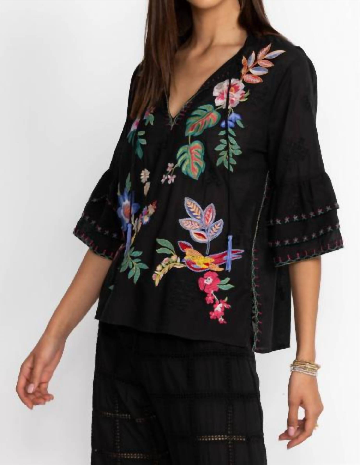 Pair this with your favorite jeans and slides for your next girls night out. Crafted from 100% cotton, this blouse offers a fresh take on a classic silhouette. It features a split V-neck with tassels, ruffle sleeves, and vibrant floral embroidery that stands out against a dark backdrop. Perfectly styled with light trousers for a striking contrast and effortless elegance.