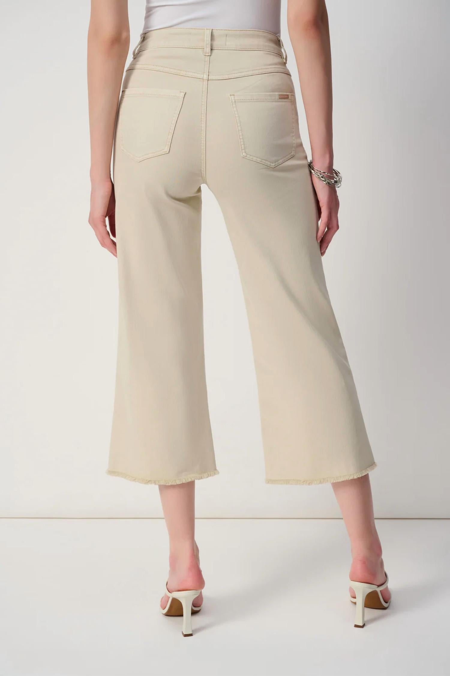 The perfect cropped jean for those transitional seasons. Revamp your collection with the Joseph Ribkoff Embellished Frayed Hem Culotte Jeans in a chic moonstone hue. Featuring a comfortable wide-leg fit, these ankle-grazing jeans are crafted from a soft cotton blend that includes 66% Cotton, 31% Polyester (Recycled), and 3% Spandex, ensuring flexibility and style. The button-zip closure and embellished front seam add a touch of flair, while the practical four pockets offer convenience. Made in China, these jeans are best cared for by hand washing in cold water and line drying, adhering to the detailed wash instructions included.