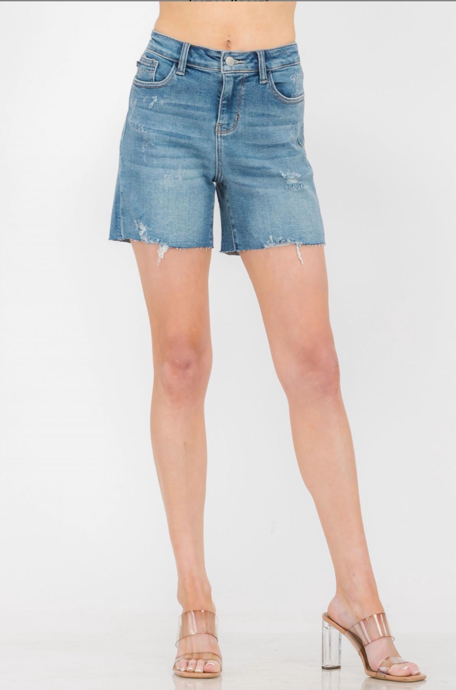 Jean shorts so versatile, you can literally wear them with anything. Meet the Judy Blue Cut Off Mid Thigh Jean Shorts, a must-have for your summer wardrobe in classic blue denim. With a comfortable pull-on closure, these shorts are designed for ease and style, featuring a JB embroidered pocket detail. Crafted from 94% Cotton, 5% Polyester, and 1% Spandex, they offer a flattering fit with a 5.5" inseam and a 10.5" rise. Care for these minimalist shorts with machine washing and tumble drying, perfect for a relaxed holiday party look. Model is wearing size S (5'8" height, 24" waist).