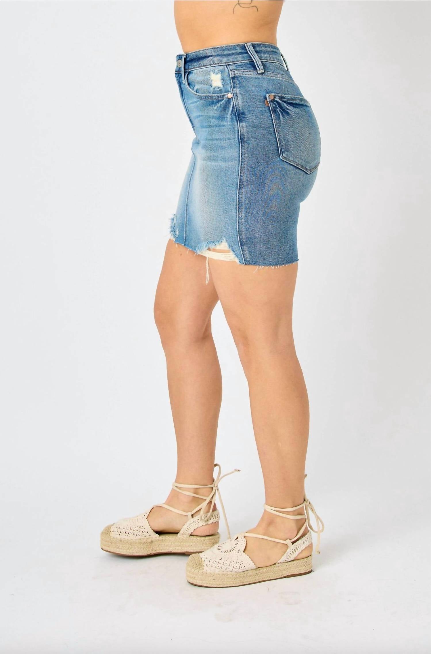 Embrace effortless style with the Fray Hem Distressed Jean Skirt by Judy Blue, designed in a medium wash for a chic, casual vibe. Crafted mainly from cotton, this women's mini skirt features a unique blend of 100% cotton front and a back panel with added polyester and spandex, ensuring a slight stretch. It includes functional pockets and a button closure for convenience. Care instructions recommend a machine wash and tumble dry to maintain its solid pattern and frayed hem.