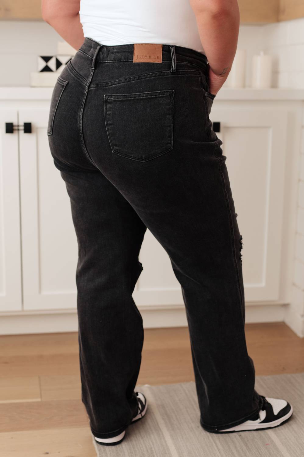 Pair these straight leg jeans with flats, sandals or even heels! You can't go wrong. Introducing the Judy Blue High Rise Rigid Magic 90's Distressed Straight Jeans in classic black, designed for effortless style with a grunge twist. These jeans highlight a heavily distressed 90s-inspired straight silhouette and offer exceptional comfort with a 100% cotton rigid front panel and a 4-way stretch back panel. Composition: Front Panel - 100% Cotton; Back Panel - 69% Cotton, 23% Polyester, 7% Rayon, 1% Spandex. Closure: Zip closure. Care: Machine wash and tumble dry. Dimensions: Inseam 32", with sizes ranging from Waist 26" to 44". Model Amanda wears size 0/24, while Model Kirra wears size 13/31.