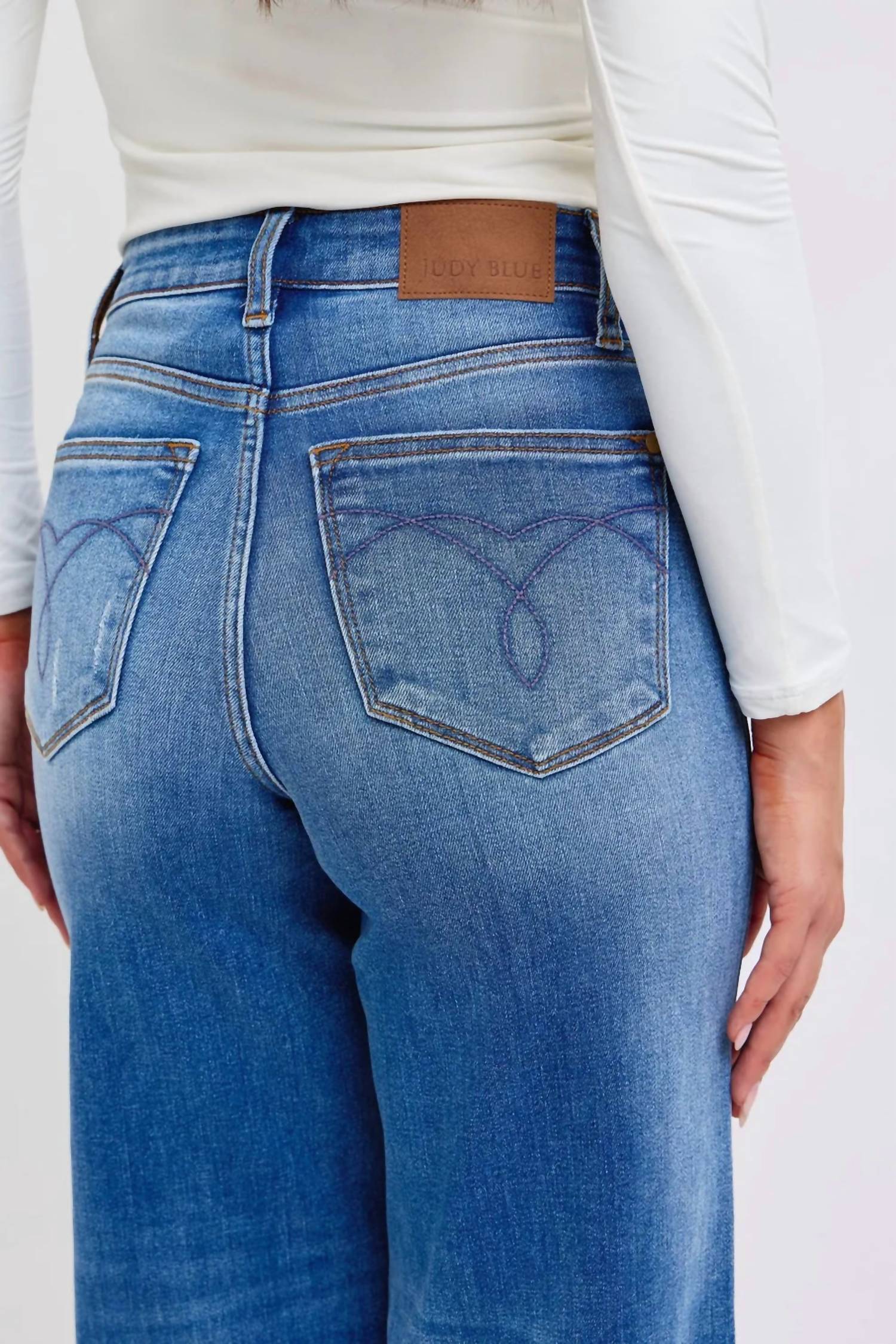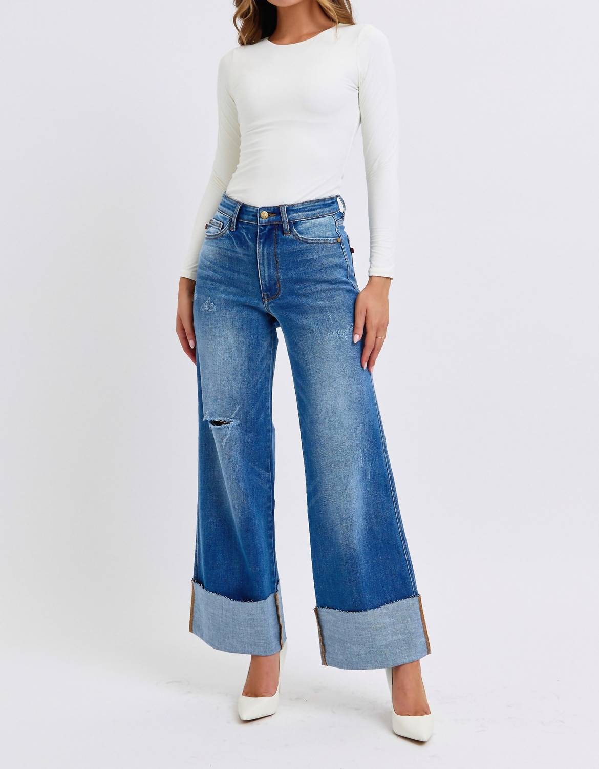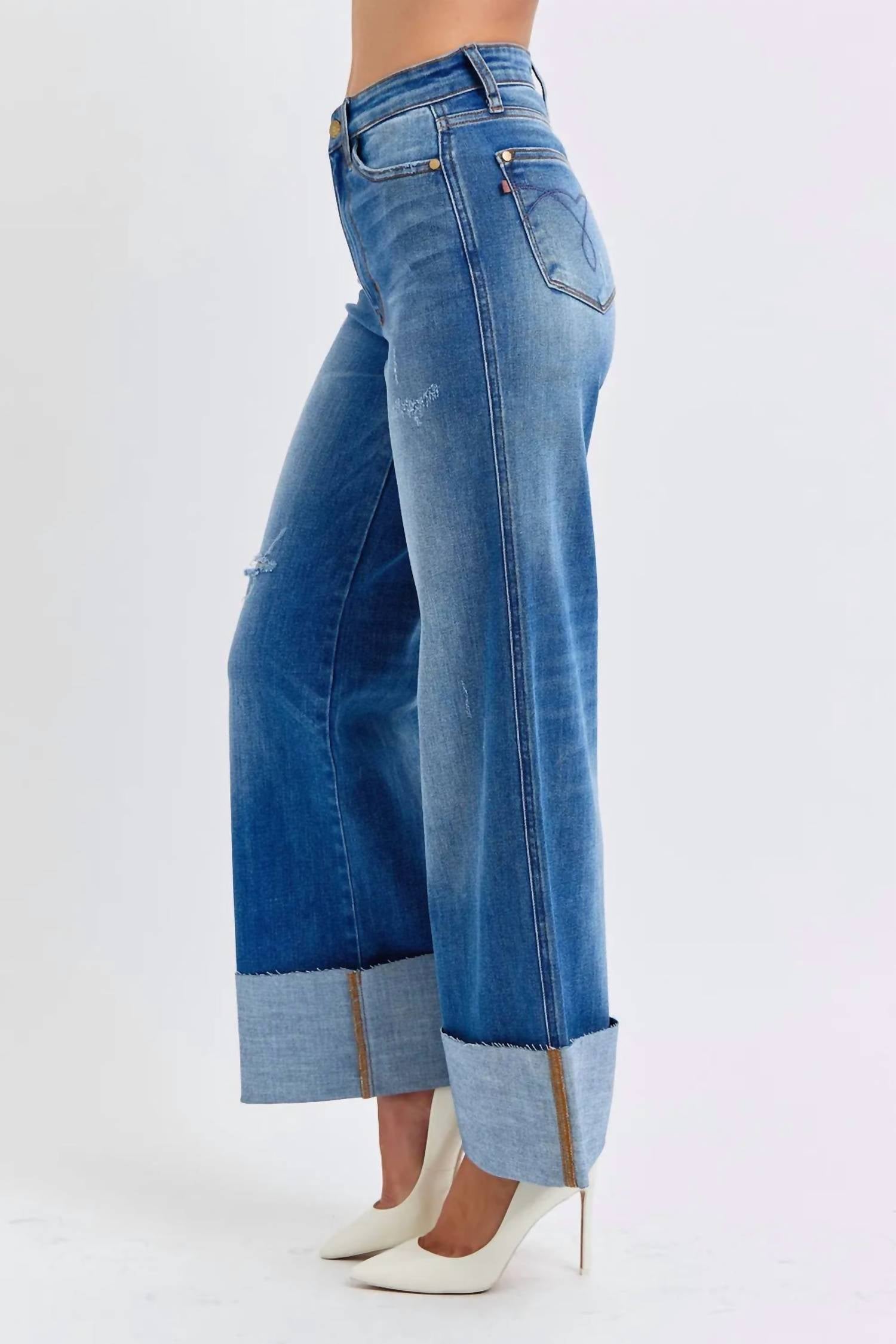 Introducing the Retro Wide Leg Jeg Jeans With Cuff by Judy Blue, a chic addition to your denim collection in versatile blue. These jeans feature a solid pattern with a high-rise waist and a relaxed fit, complemented by a moderate stretch for comfort. Composition includes 69% cotton, 16% polyester, 9% rayon, 5% elasterell, and 1% spandex, offering both durability and style. Designed with a button closure, these jeans boast a flattering 11" rise and a versatile inseam of 29" cuffed or 34" uncuffed. Feel effortlessly trendy with their wide leg silhouette and distressed details, perfect for a spring travel occasion. Made in Vietnam, care involves machine washing cold and tumble drying low.