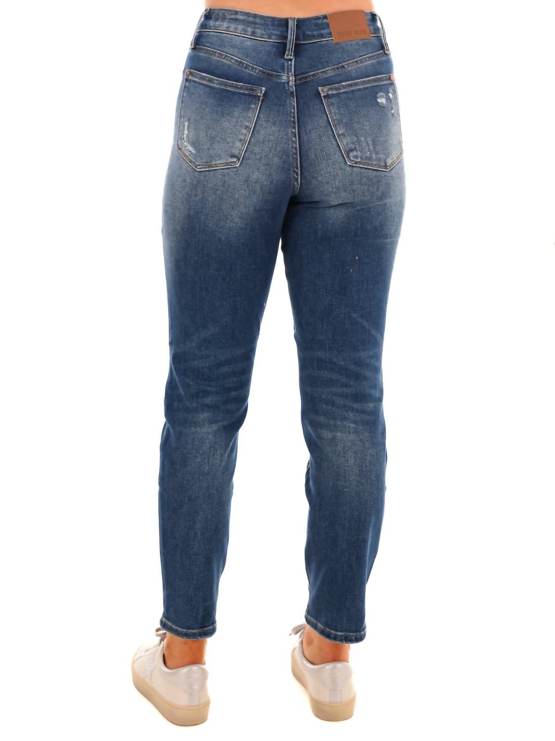 Meet the Judy Blue Women's Happy Together Tummy Control Slim Jeans, perfect for flaunting your curves with confidence. These high-rise, dark wash jeans feature a slimming zip closure and pocket design in a solid pattern. Made from 76.2% Cotton, 22.5% Polyester, 1.3% Spandex, they combine comfort with a flattering slim fit and classic straight leg style. Care is simple with machine wash and tumble dry, making them an easy addition to your streetwear collection.
