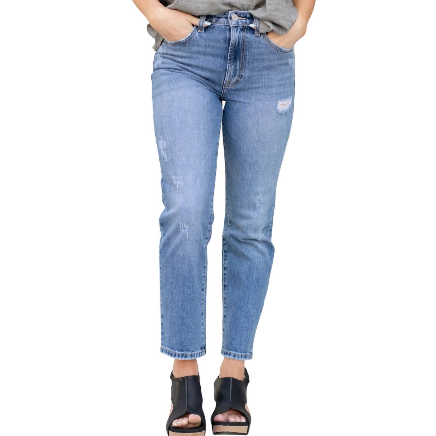 This classic straight leg jean has a perfect fit and goes with just about everything. Experience timeless style with the Yumi High Slim Straight Jeans from KanCan, designed for the modern woman. This pair boasts a high-rise 11" rise with a 27" inseam, ensuring a flattering silhouette. Crafted from a 99% Cotton and 1% Spandex blend, it features a solid blue hue with a classic straight leg. Closure: Single button front with a zip fly.