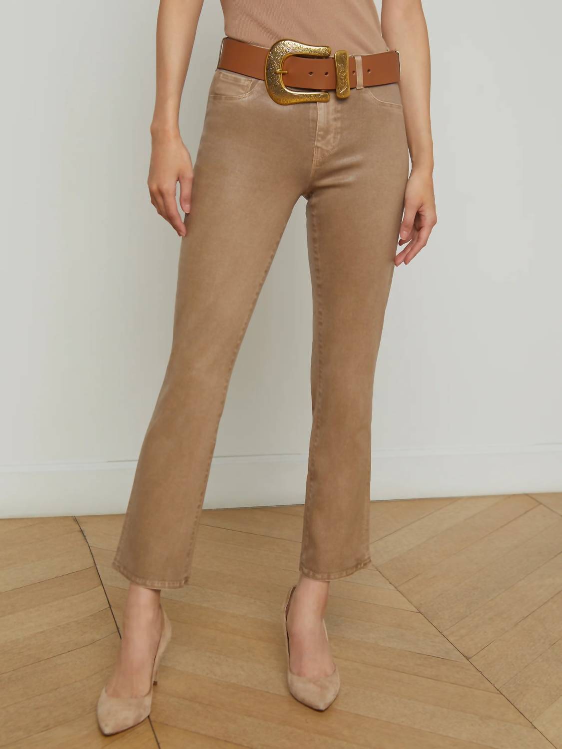 Discover the Tati High Rise Cropped Micro Boot Jean by L'Agence, a chic addition in stylish Rye Coated. This bootcut leg jean features a high-rise waist and a slim fit from hip to knee, crafted from a coated stretch cotton blend for a leather-look finish. The pants include faux front pockets, functional back pockets, and a zip fly with a button closure. Care instructions suggest spot or wipe clean only. The 27” inseam adds a contemporary edge, perfect for an evening event or streetwear ensemble.
