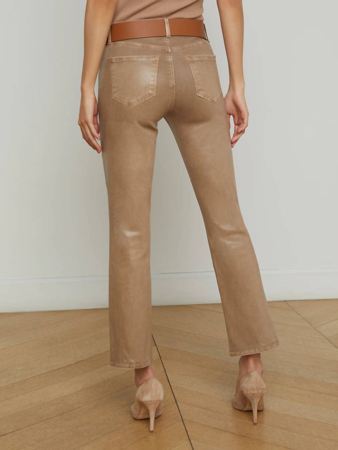 Just add boots! Discover the Tati High Rise Cropped Micro Boot Jean by L'Agence, a chic addition in stylish Rye Coated. This bootcut leg jean features a high-rise waist and a slim fit from hip to knee, crafted from a coated stretch cotton blend for a leather-look finish. The pants include faux front pockets, functional back pockets, and a zip fly with a button closure. Care instructions suggest spot or wipe clean only. The 27” inseam adds a contemporary edge, perfect for an evening event or streetwear ensemble.