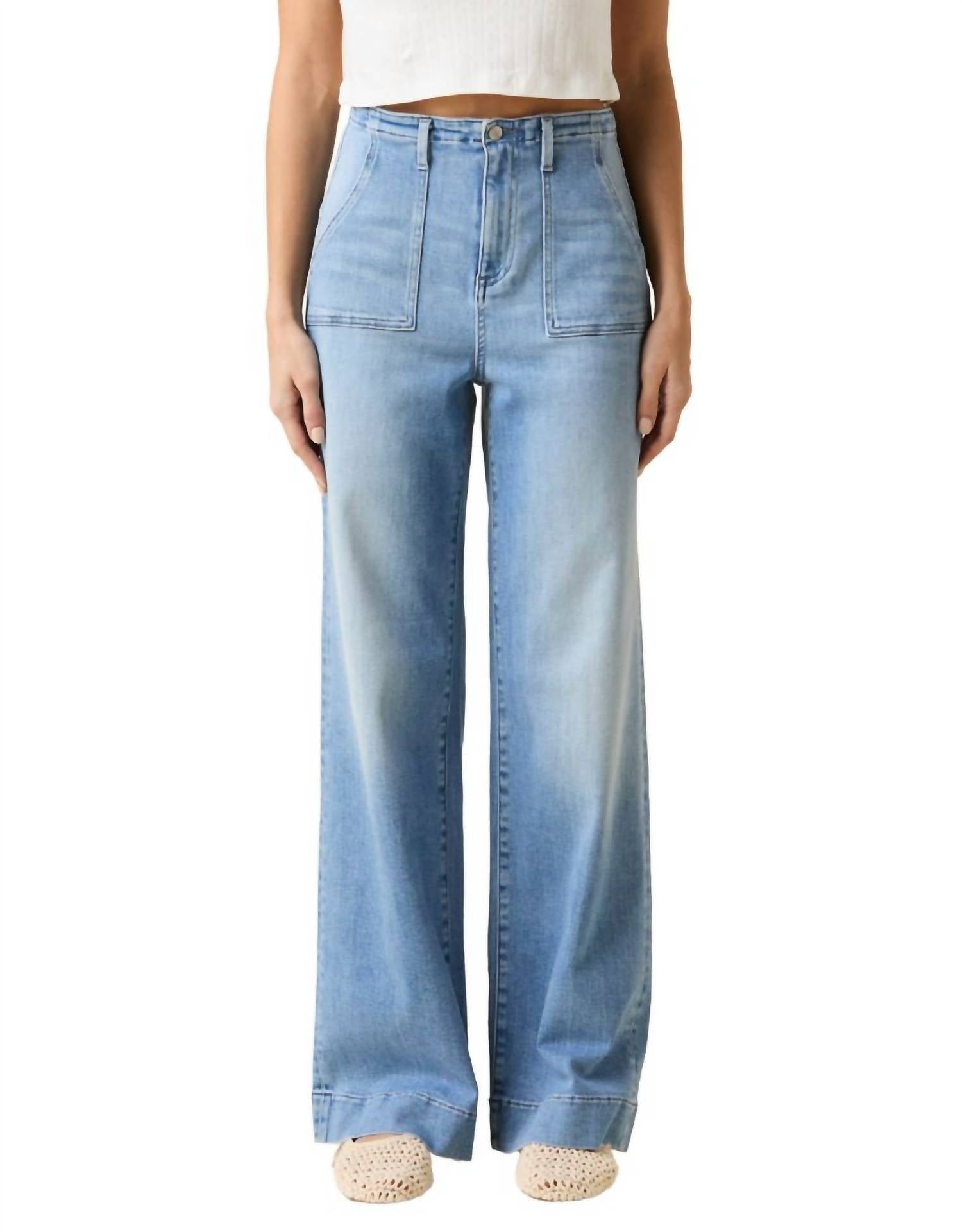 Pair these wide leg jeans with mules, slides or your favorite strappy sandals. Step out in style with the Women's Utility Trouser Pants by Le Jean, tailored in a captivating Romance hue. These pants feature a wide leg design and textured pattern, perfect for embracing the streetwear trend. With a zip closure and practical pockets, they strike the balance between utility and fashion. Ideal for summer vacation wear, they come in a light wash to complete the laid-back yet stylish look.