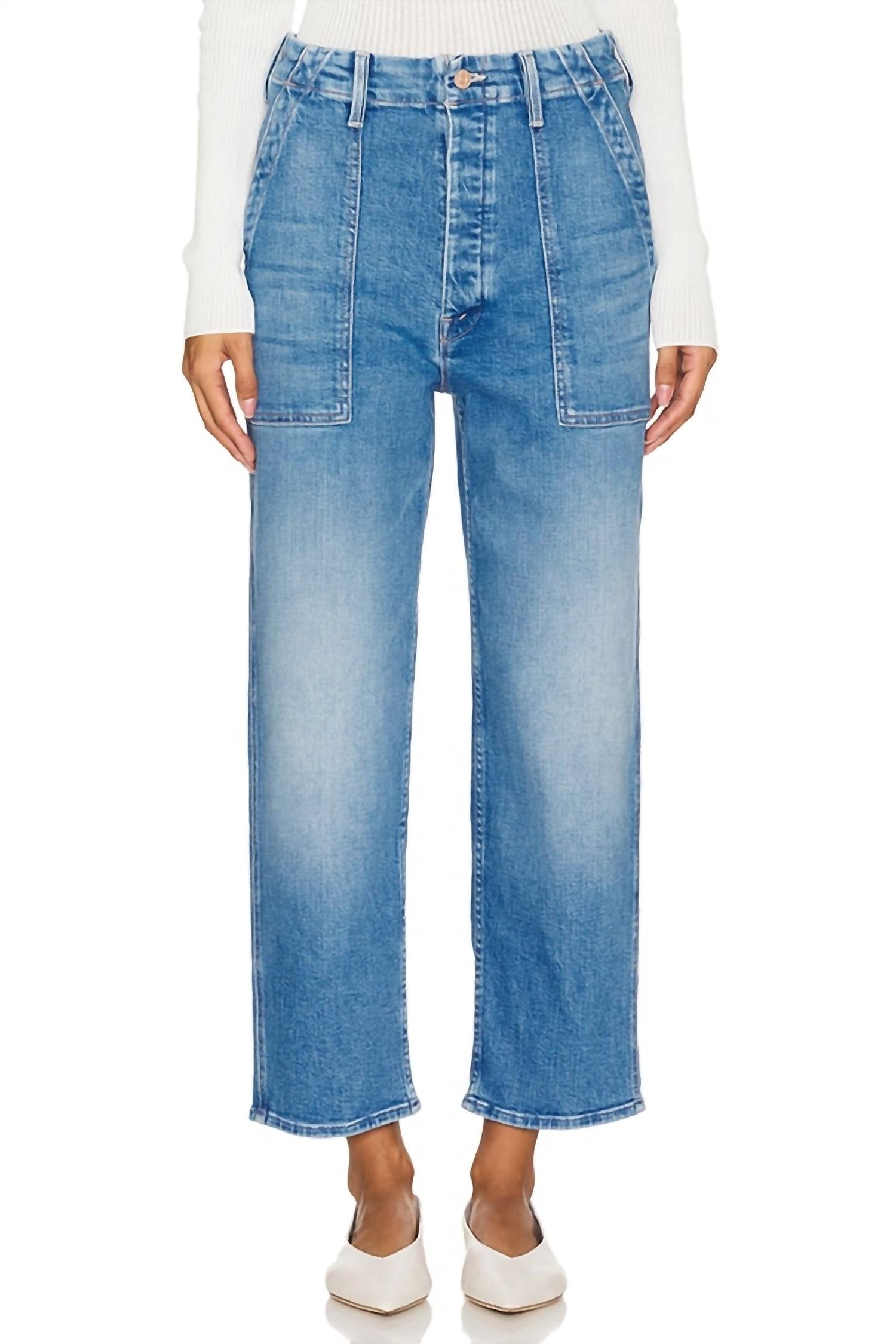 Meet the Patch Pocket Private Flood Wide Straight Leg Jean by Mother, a timeless piece perfect for a retro-inspired wardrobe. Crafted from a cotton blend, these wide-leg jeans come in a bold "Flag Me Down" color and feature practical patch pockets. Perfect for summer occasions, they boast a solid pattern and a classic button closure for a stylish fit. Care for these jeans with ease, thanks to their machine washable design, ideal for a Thanksgiving vacation or any relaxed gathering.
