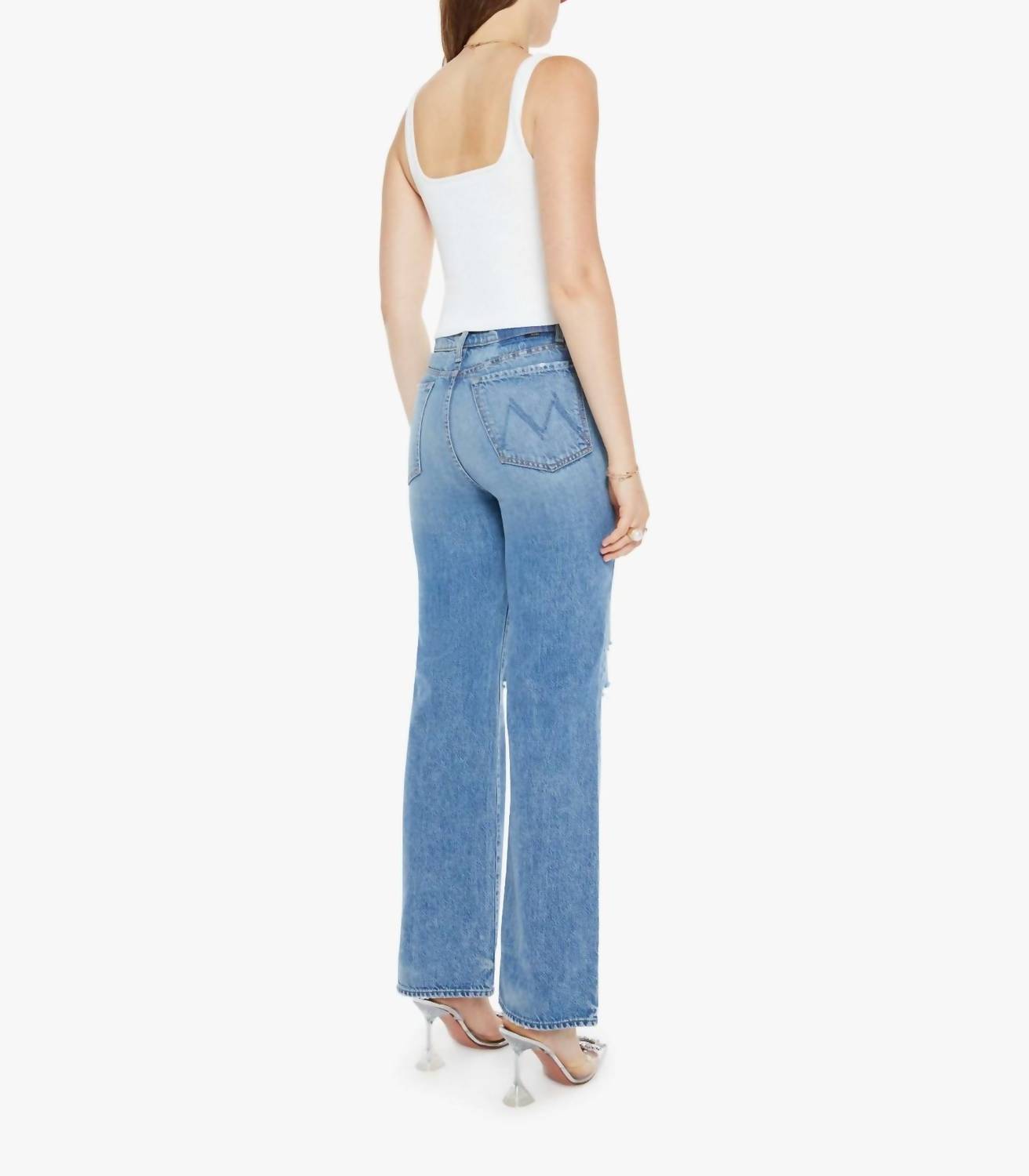 This classic straight leg jean has a perfect fit and goes with just about everything. Elevate your denim game with the Rambler Sneak Wide Straight Leg Jeans by Mother, a chic addition to any wardrobe. These blue, high-waisted jeans feature a 32-inch inseam and a wide straight leg, designed from 100% cotton rigid OMG SUPERIOR denim with unique whiskering, fading, and distressed details. Made in Los Angeles, these jeans offer a stylish mid-blue wash perfect for grunge-inspired looks. Featuring a zip closure and machine washable design, they offer both style and convenience, completed with a 17 3/4-inch leg opening and 11 1/4-inch rise. Model is 5'10" and wears size 26; patience is a virtue as these jeans take time to break in, ensuring a perfect fit in the long run.