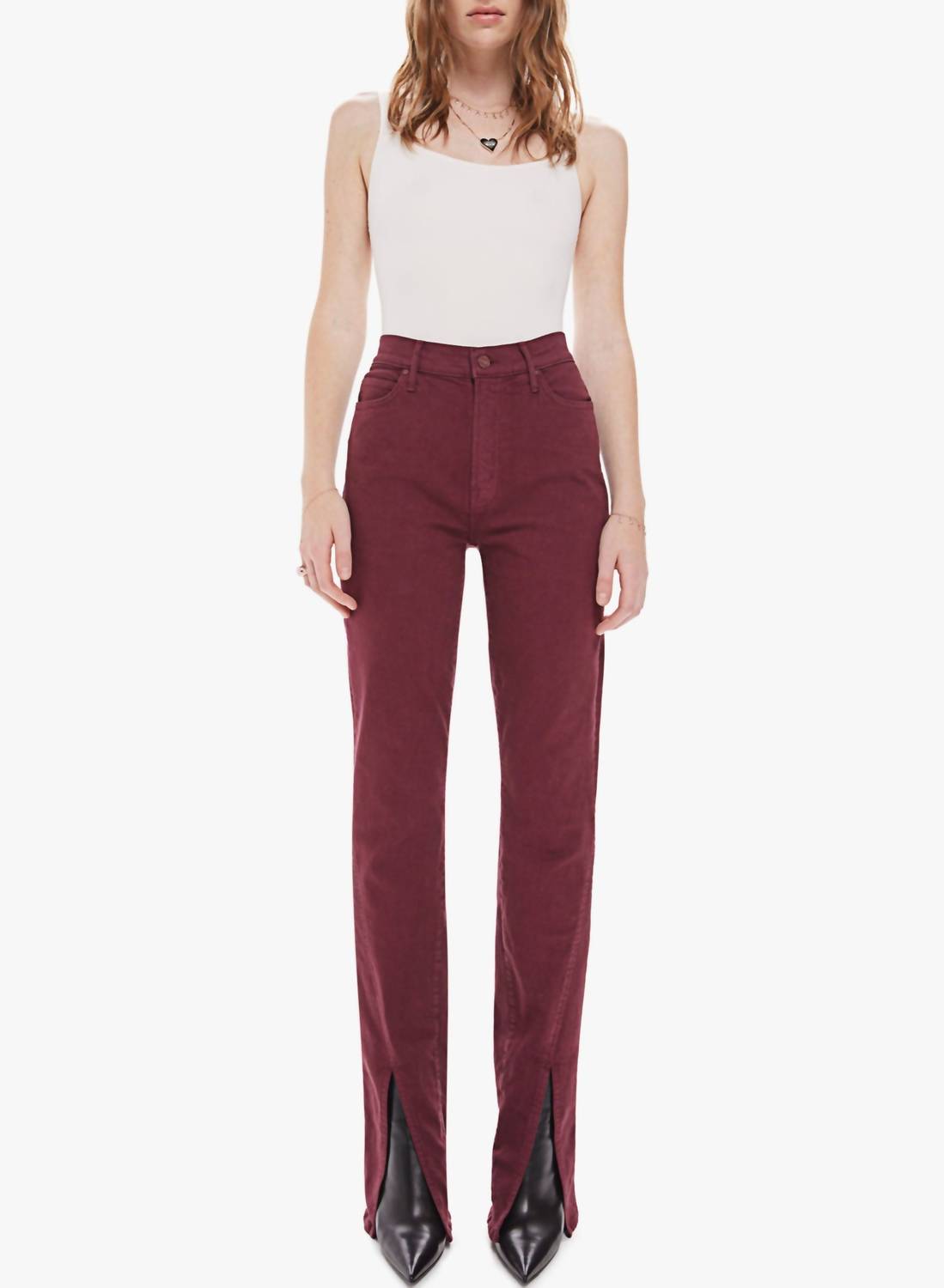 Pour decisions. A high-rise straight-leg with a 34-inch inseam and a split-hem detail. Cut from stretch cotton fabric in a red-wine hue with tonal hardware for a monochrome look.