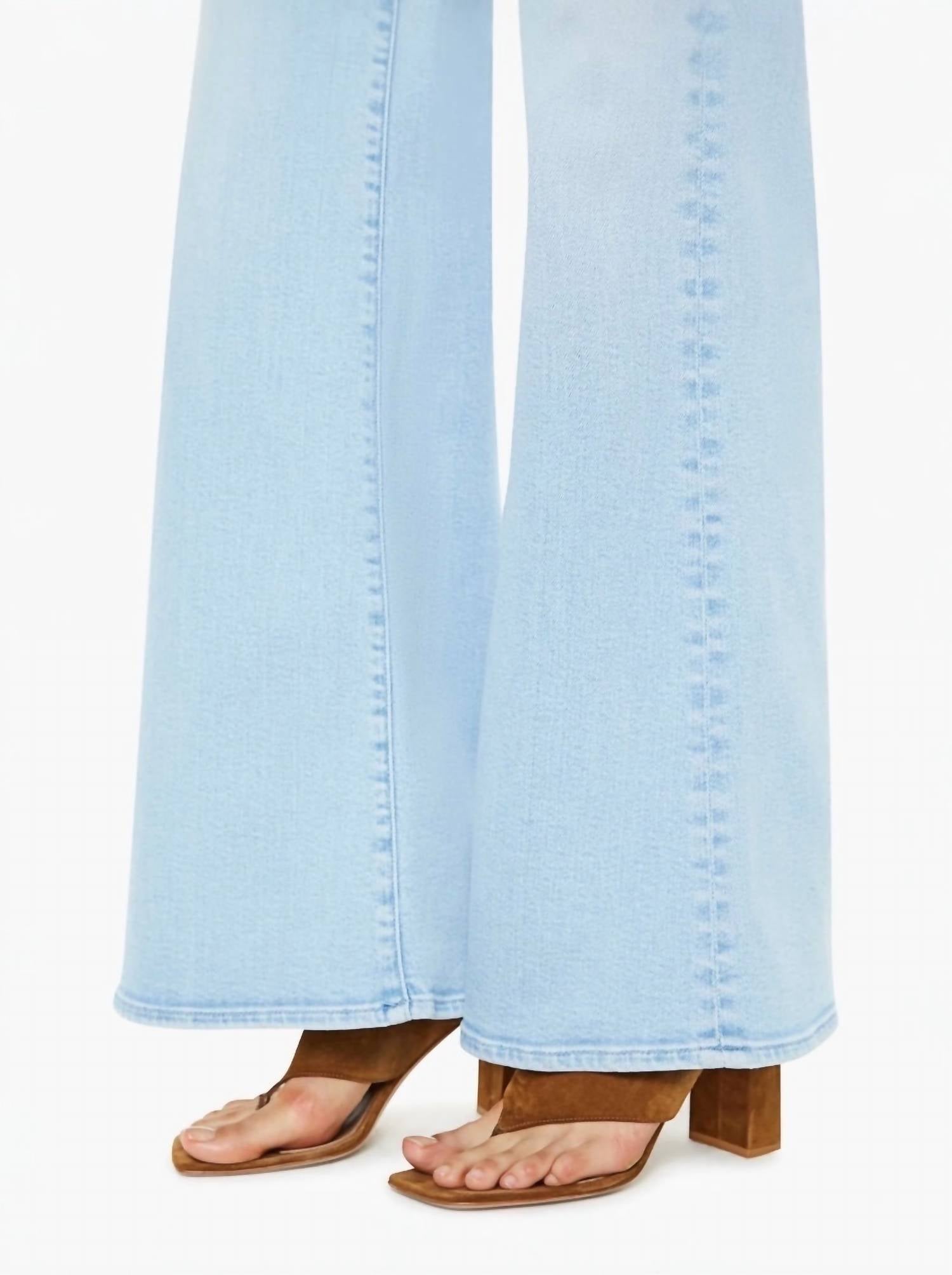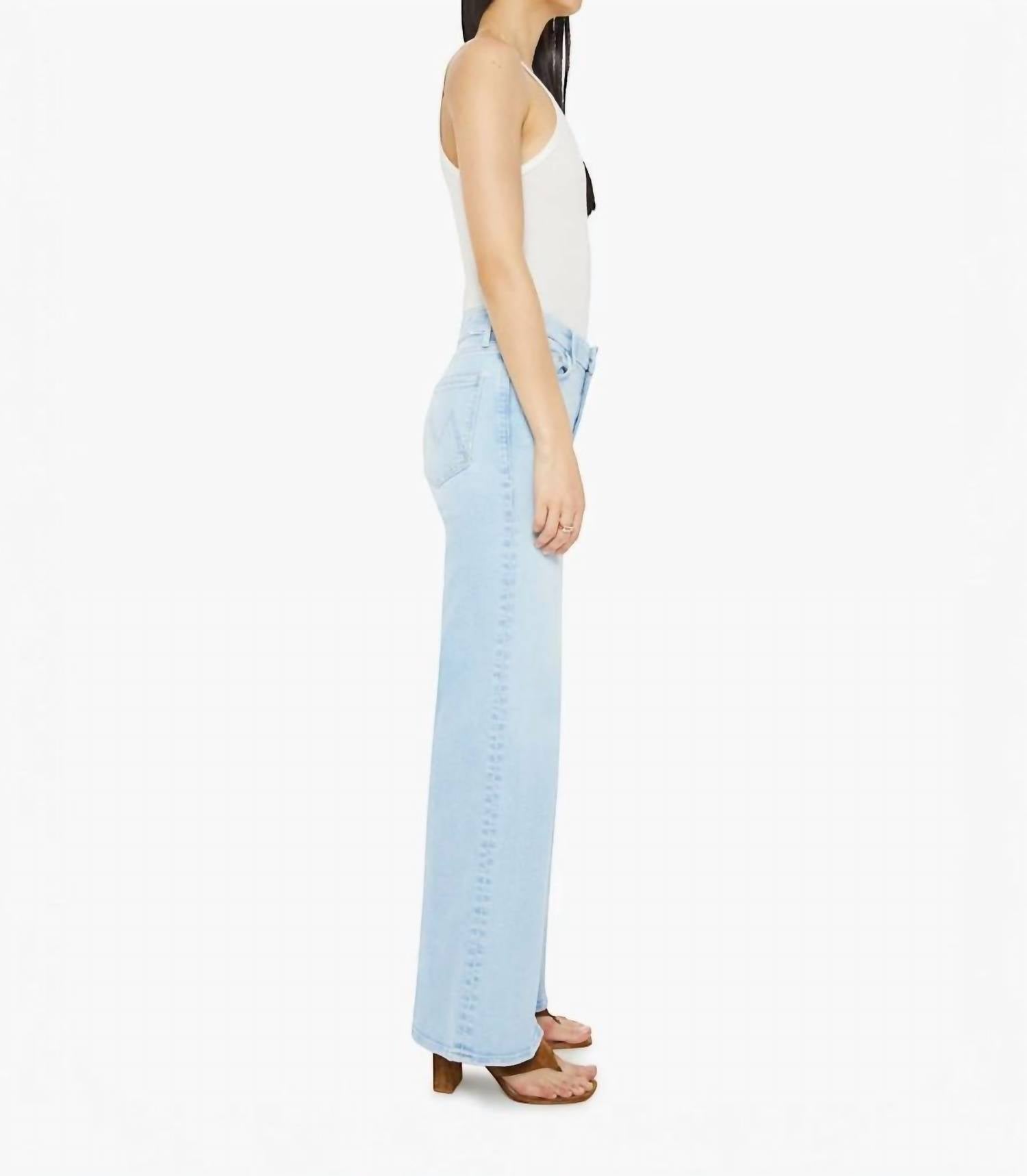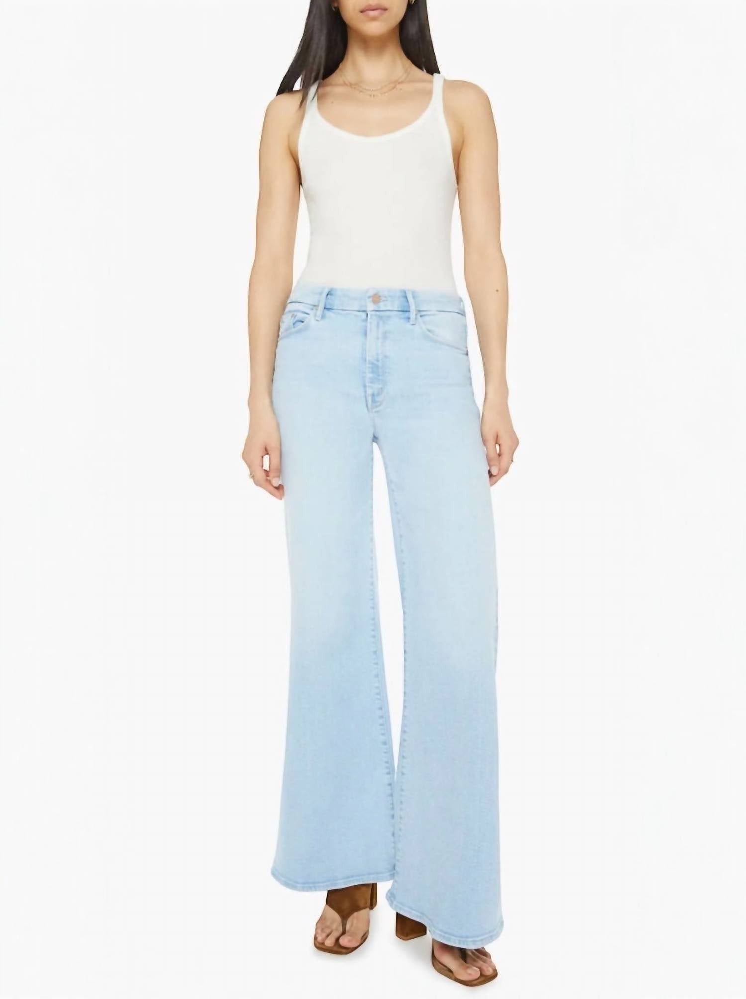 Pair these wide leg jeans with mules, slides or your favorite strappy sandals. The Roller Sneak Jeans by Mother offer a vintage-inspired style with a 70s wide-leg design. These mid-rise jeans, crafted from a cotton blend, feature a 32-inch inseam and a 26.5-inch leg opening, perfect for creating a flattering silhouette. Made in Los Angeles, their light wash and textured finish make them ideal for travel and seasonal transitions. Composition: 78% Cotton, 16% Modal, 4% Polyester, 2% Elastane. Closure: Button closure. Care: Machine wash cold.