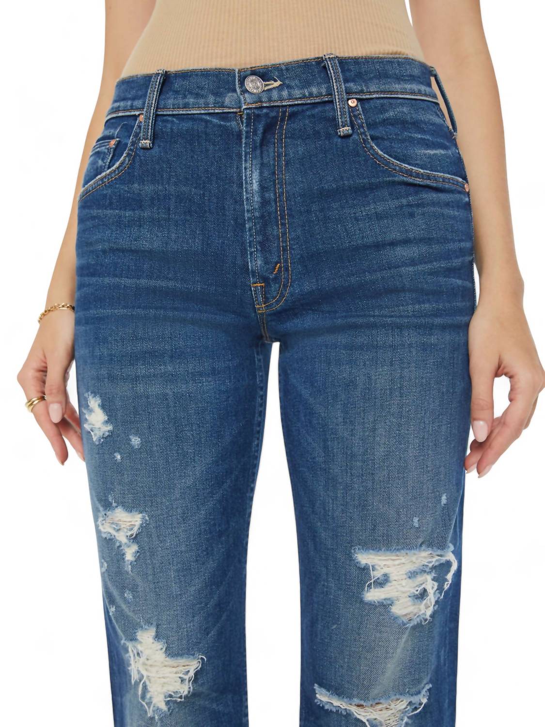 Tuck your favorite tee into these high-waist jeans for a more casual-cool feel.These mid-rise bootcut jeans have a looser fit through the leg while remaining fitted at the waist and hips. They are cut from OMG SUPERIOR denim in a mid-blue wash with hand-distressed details, whiskering, and fading. Made from 98% cotton and 2% elastane, they are machine washable. The rise measures 10 inches, the inseam is 32 inches, and the leg opening is 20 inches. The model is 5'10" and wearing a size 26. Made in the USA.