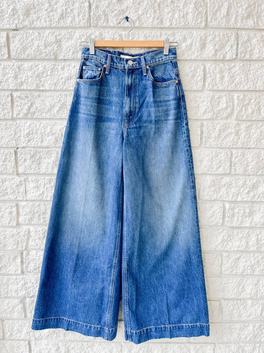 Pair these wide leg jeans with mules, slides or your favorite strappy sandals. Embrace a retro vibe with The Headliner Sneak Wide Leg Jean by Mother, designed in a captivating Green Thumb. These jeans offer a relaxed fit with a flattering mid-rise of 12 3/4 inches and a roomy 32-inch inseam, creating the perfect statement for any spring 90s-inspired look. Crafted with 100% Cotton, this medium wash denim provides a rigid structure and features a wide hem, ensuring both style and comfort. Closure: Zip closure. Care: Machine wash and tumble dry for easy maintenance. Note: This style runs one size large, so it's recommended to size down.