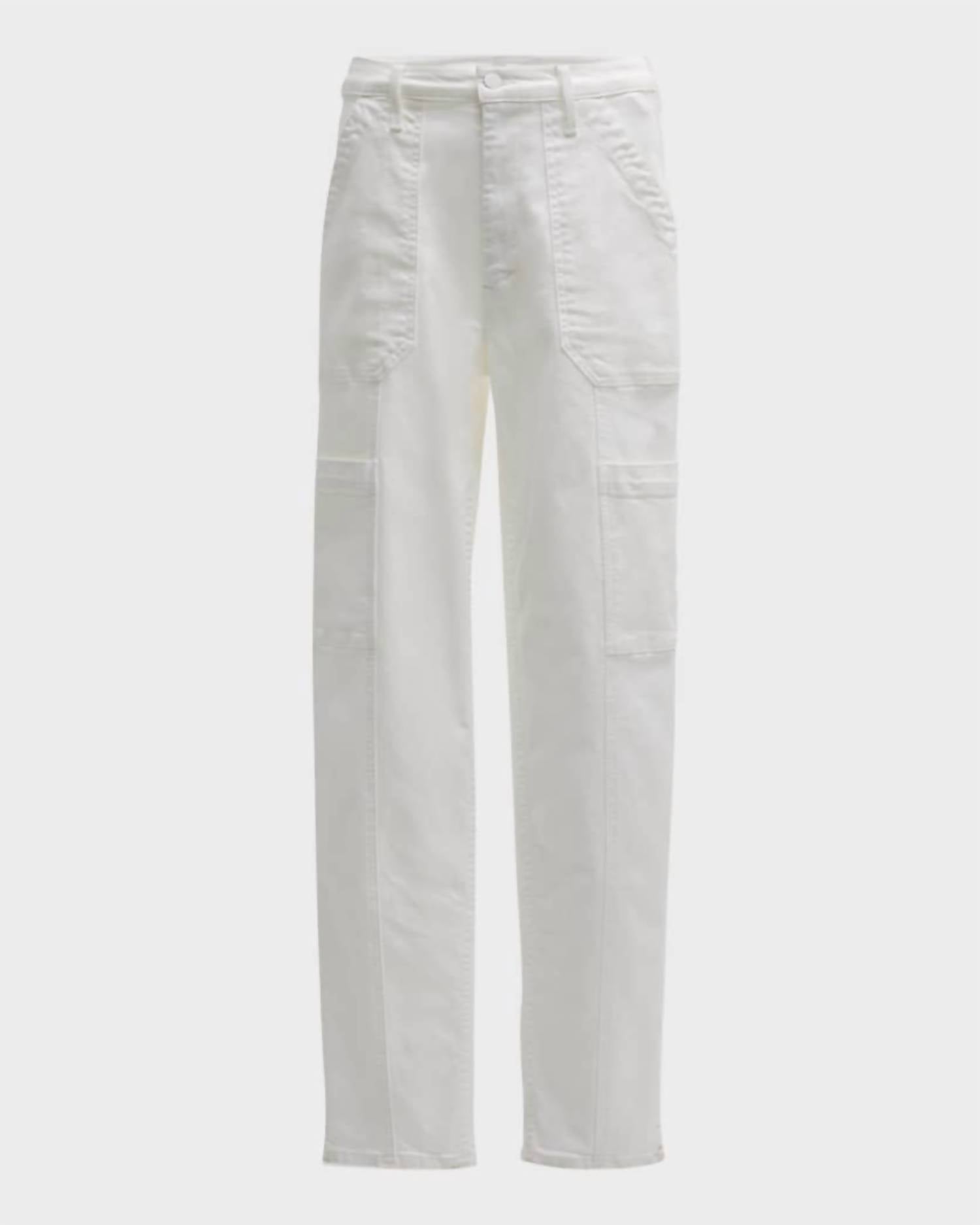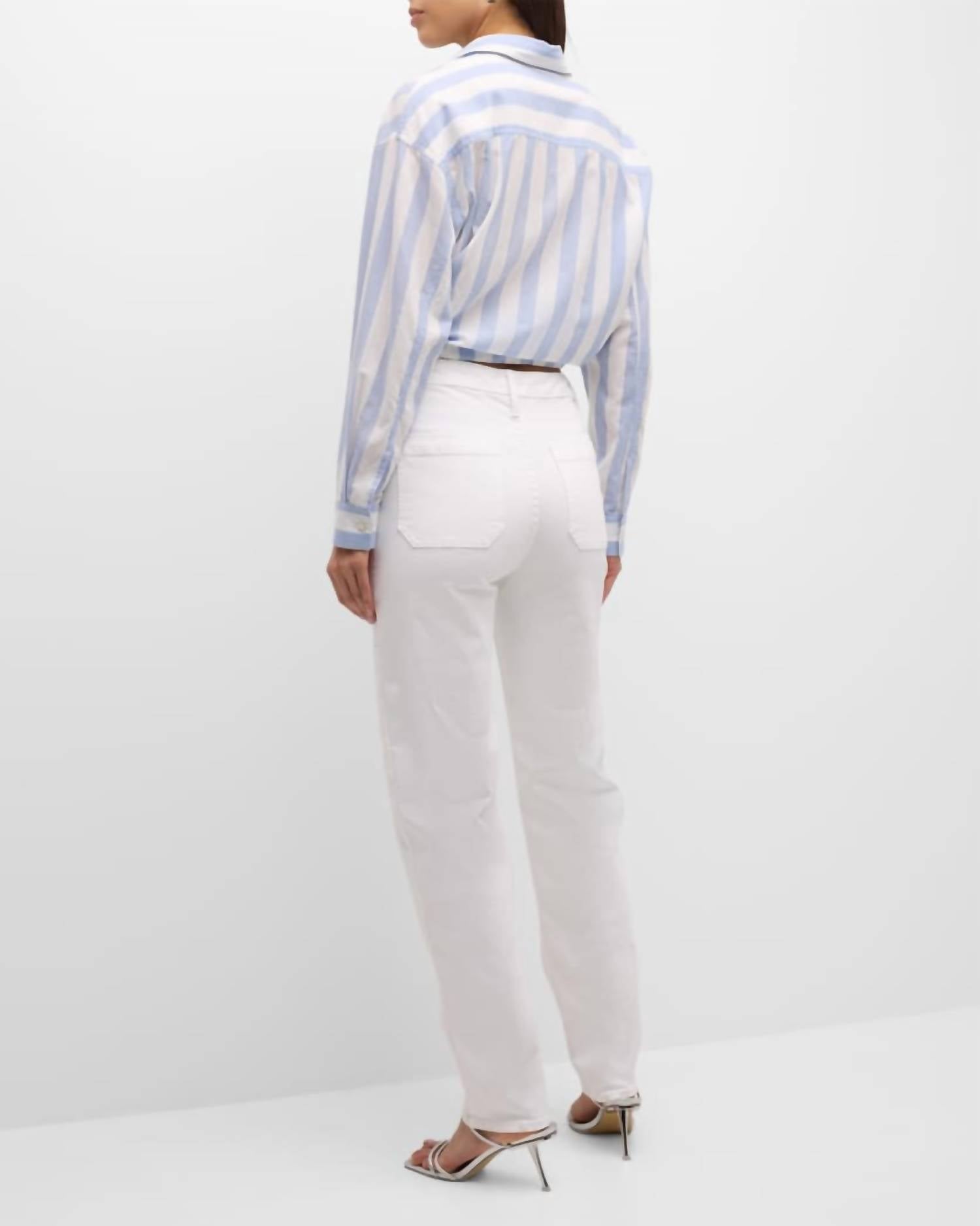 Embrace timeless style with MOTHER's The Private Double Pocket Skimp Jeans in a crisp Fairest Of Them All white denim. Designed with a 12" rise and 31" inseam, these high-rise jeans feature straight, tapered legs and practical patch pockets. Crafted from a comfortable cotton blend, they offer a secure fit with a zip closure and button/zip fly. Made in the USA, these full-length jeans are perfect for summer, and it's advised to order a size down as they run large. Model is 5'10"/177cm.