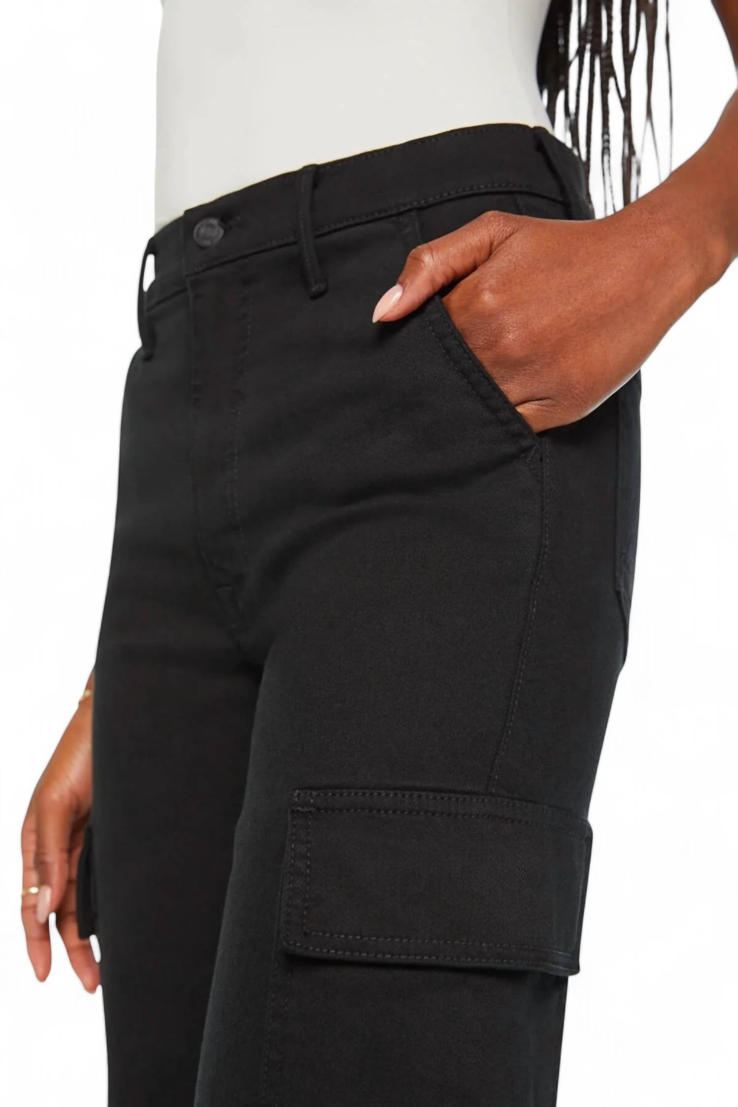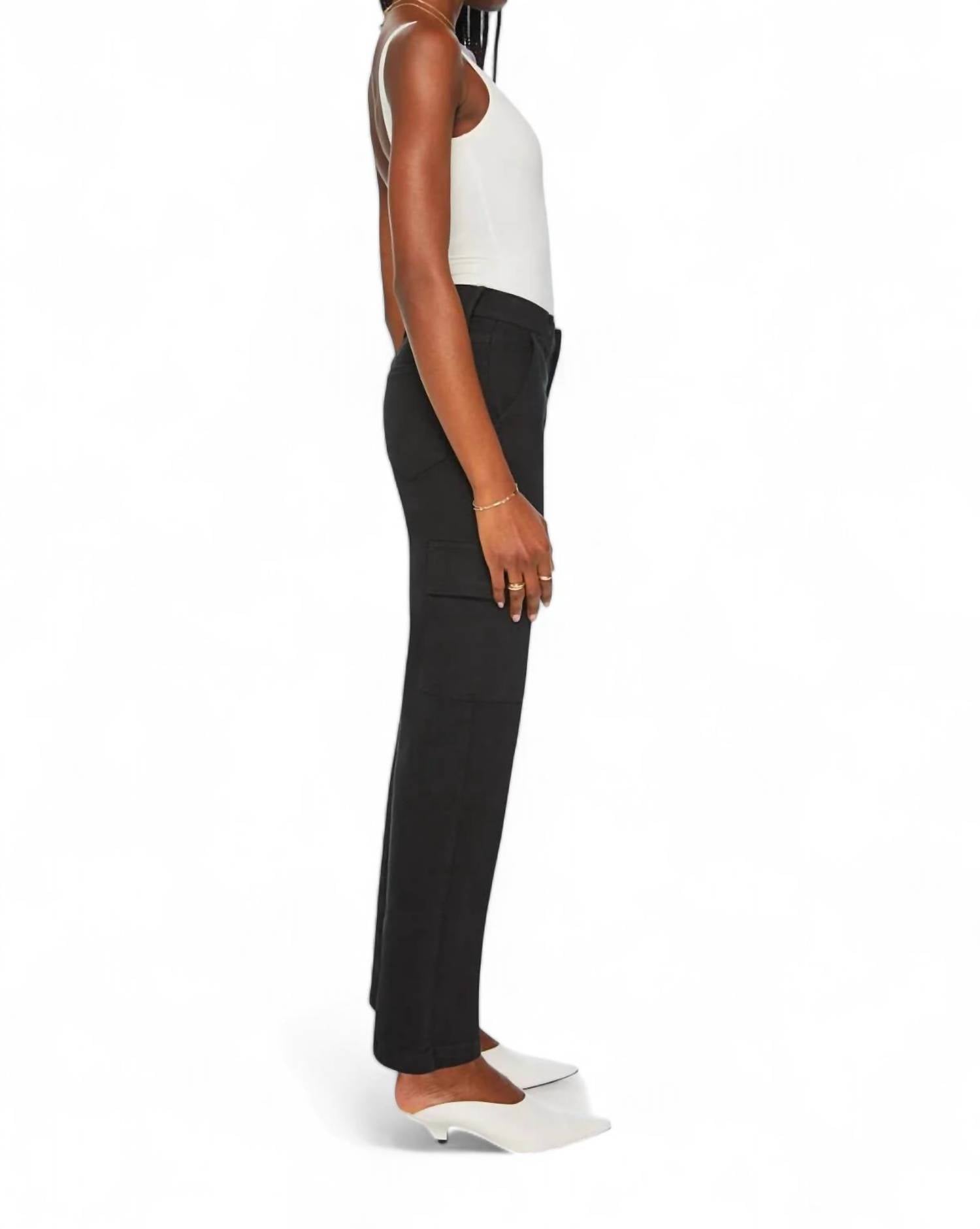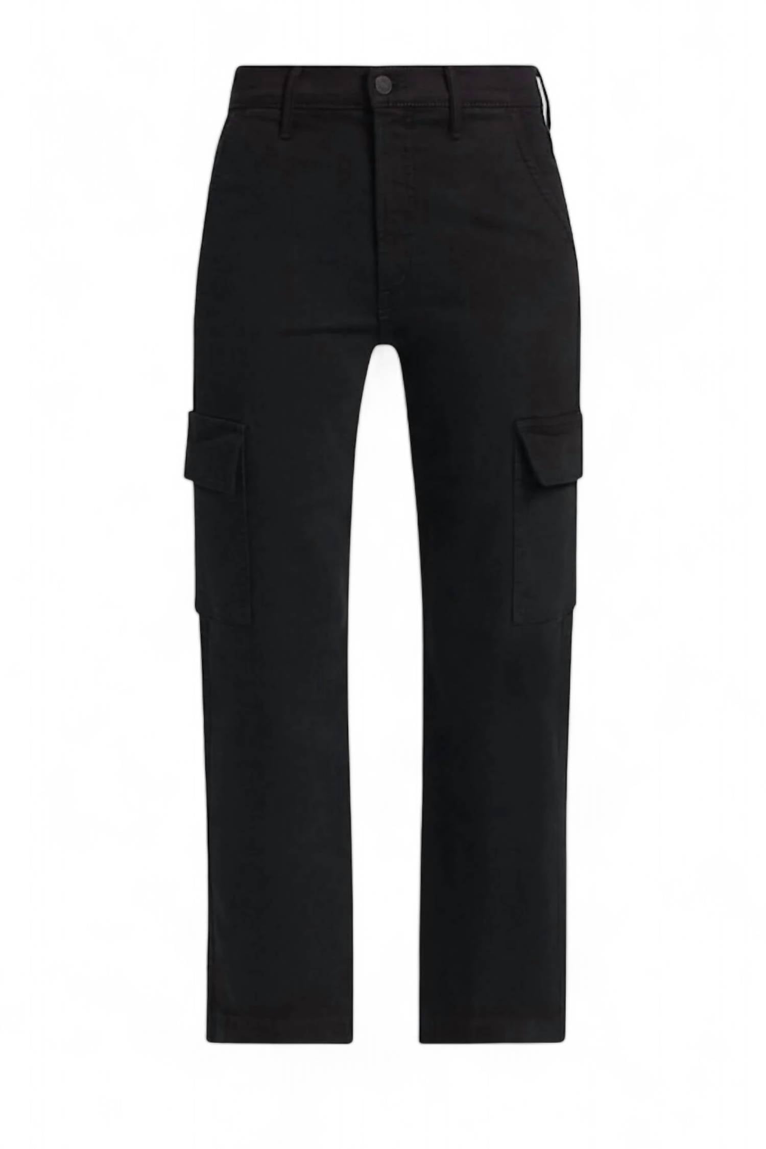 Pair these straight leg jeans with flats, sandals or even heels! You can't go wrong. These high-waisted jeans feature a wide straight leg, cargo pockets, and a zip fly. Crafted from a recycled denim blend with a touch of stretch, they are solid black with tonal hardware, ensuring a sleek and sustainable design. The composition is 68% cotton, 18.5% recycled polyester, 12% reused cotton, and 1.5% elastane. Machine wash cold. Measurements include an 11 1/4-inch rise, a 31-inch inseam, and a 17 1/2-inch leg opening. The model is 5'9 1/2" and wears a size 26. Made in the USA.