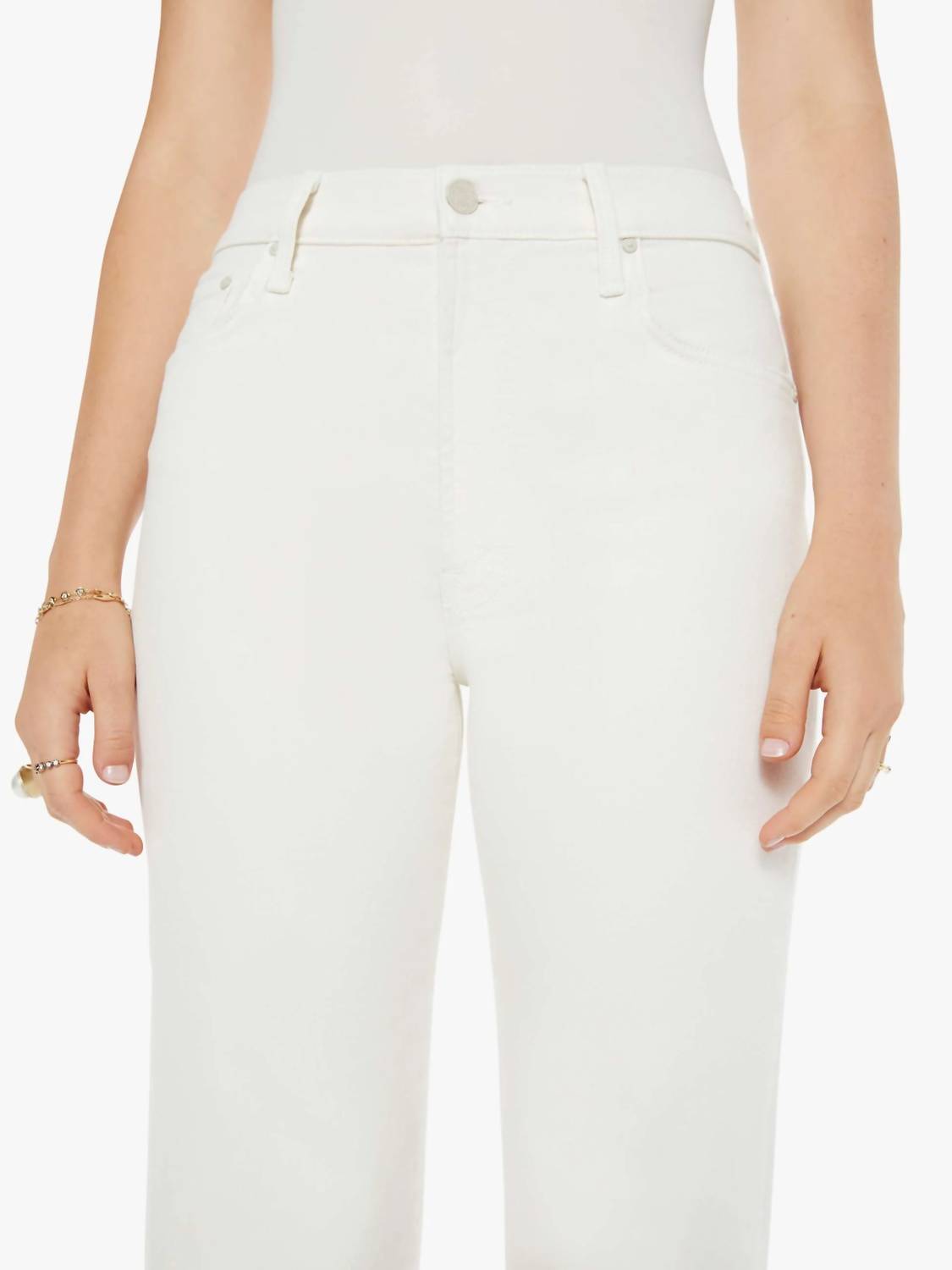 We especially love this cropped jean with a cute pair of slides or sandals. Introducing The Rambler Zip Ankle Jean by Mother, expertly crafted to enhance your style in Cream Puffs' off-white elegance. These high-waisted pants feature a wide straight leg with a regular fit and a clean, ankle-length inseam. Made from a stretch fabric blend of 94% Cotton, 4% Polyester, and 2% Elastane, they ensure comfort and flexibility. Closure is secured with a sleek zip closure. Made in Los Angeles.