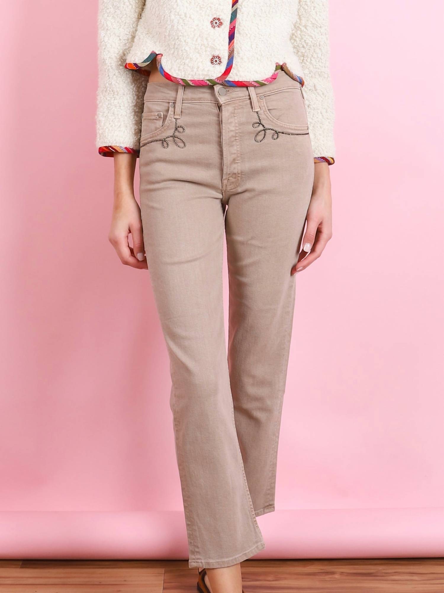 We especially love this cropped jean with a cute pair of slides or sandals. Introducing the Tomcat Ankle Rodeo Jeans by Mother, crafted for the modern rodeo girl with an indie spirit. These high-rise jeans showcase a straight leg and an ankle-length inseam of 27.5 inches, complete with a 10.75-inch rise and a clean hem. Made in a cotton blend, these jeans boast a Farmer's Tan hue with black printed details and tonal hardware, accentuated by embroidered pockets. Closure: Button closure. Composition: 60% Cotton, 37% Lyocell, 3% Elastane. Care instructions not provided.