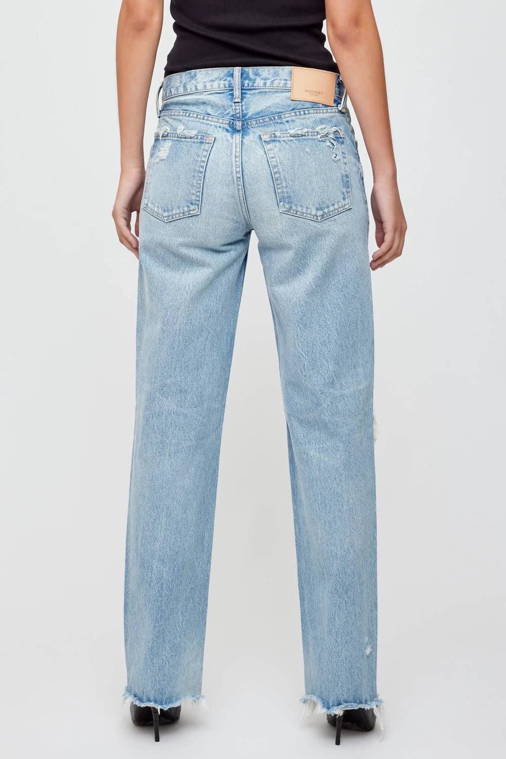 Explore the fashionable ease of the Odessa Straight Low Rise Jeans by Moussy, perfect for a chic spring look. These light blue jeans boast a high-rise design with a button fly closure and ripped knees, offering a contemporary streetwear vibe. Made from 100% cotton mid-weight denim with cowhide leather label accents, they provide a slim fit through the hip and a loose, straight leg silhouette. Imported from Japan, these jeans are machine washable on a delicate cycle and require no tumble drying, ironing with a press cloth recommended. Model is 177cm/5'8" and wears a size 26.