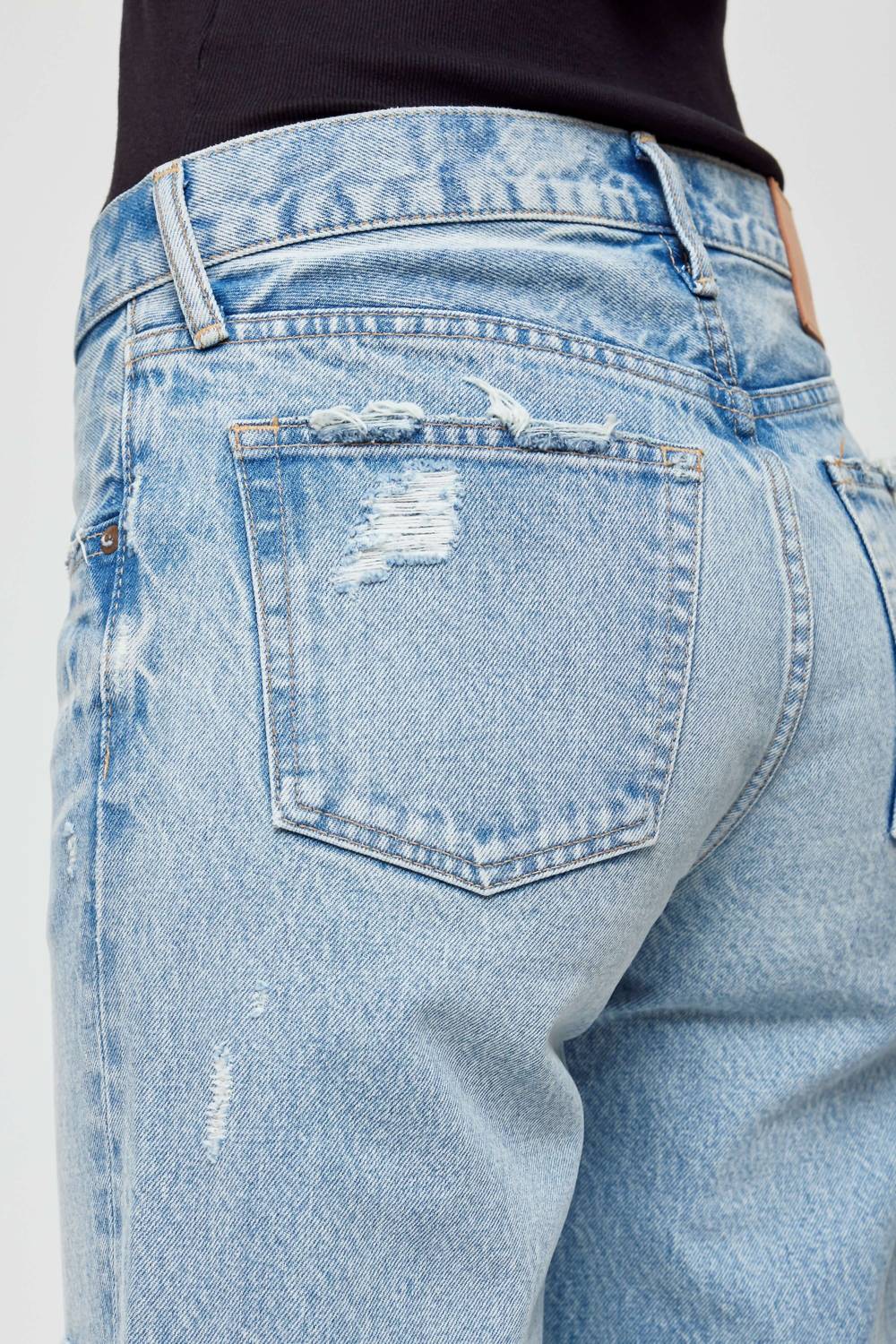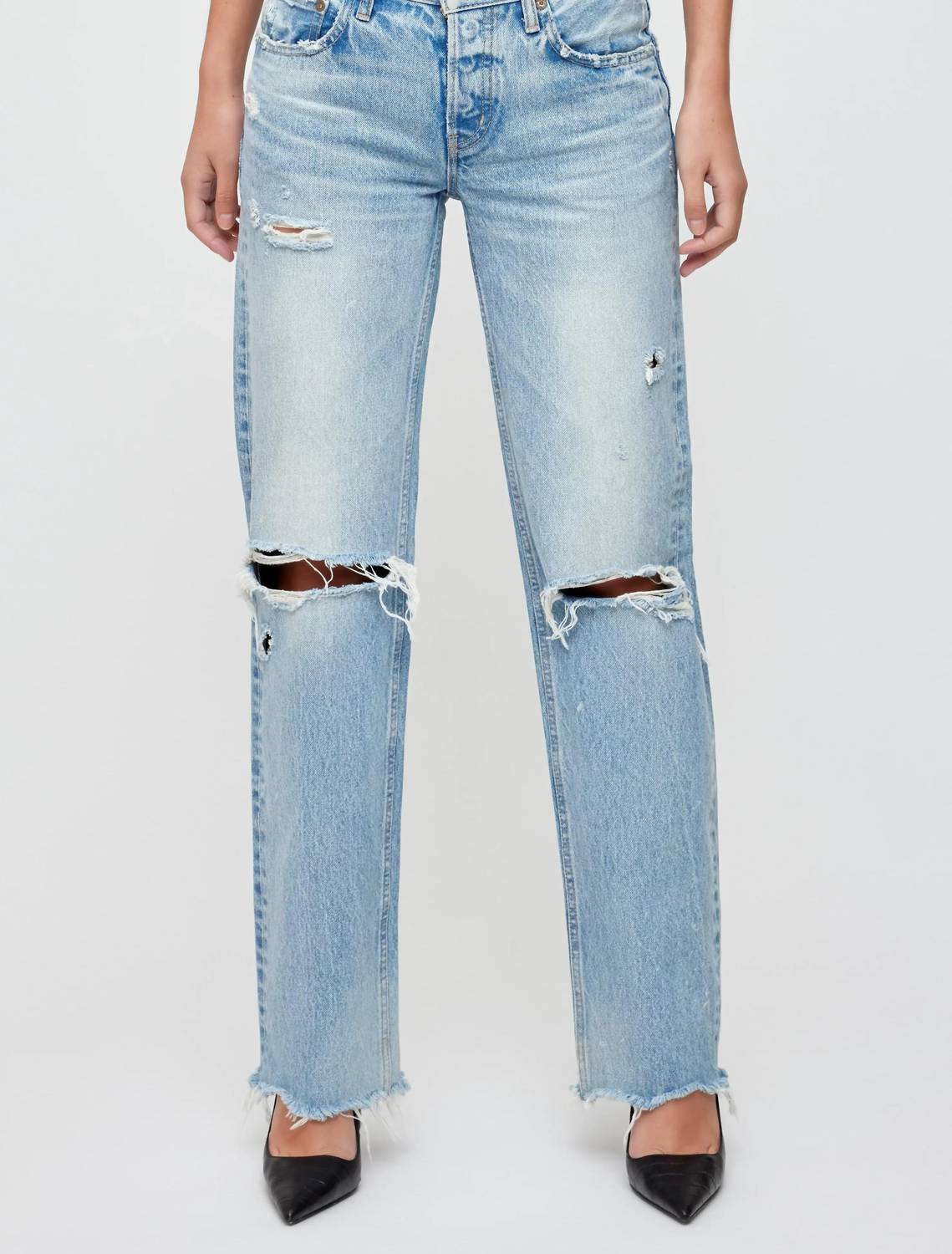 These must-have jeans are fit to perfection. Explore the fashionable ease of the Odessa Straight Low Rise Jeans by Moussy, perfect for a chic spring look. These light blue jeans boast a high-rise design with a button fly closure and ripped knees, offering a contemporary streetwear vibe. Made from 100% cotton mid-weight denim with cowhide leather label accents, they provide a slim fit through the hip and a loose, straight leg silhouette. Imported from Japan, these jeans are machine washable on a delicate cycle and require no tumble drying, ironing with a press cloth recommended. Model is 177cm/5'8" and wears a size 26.