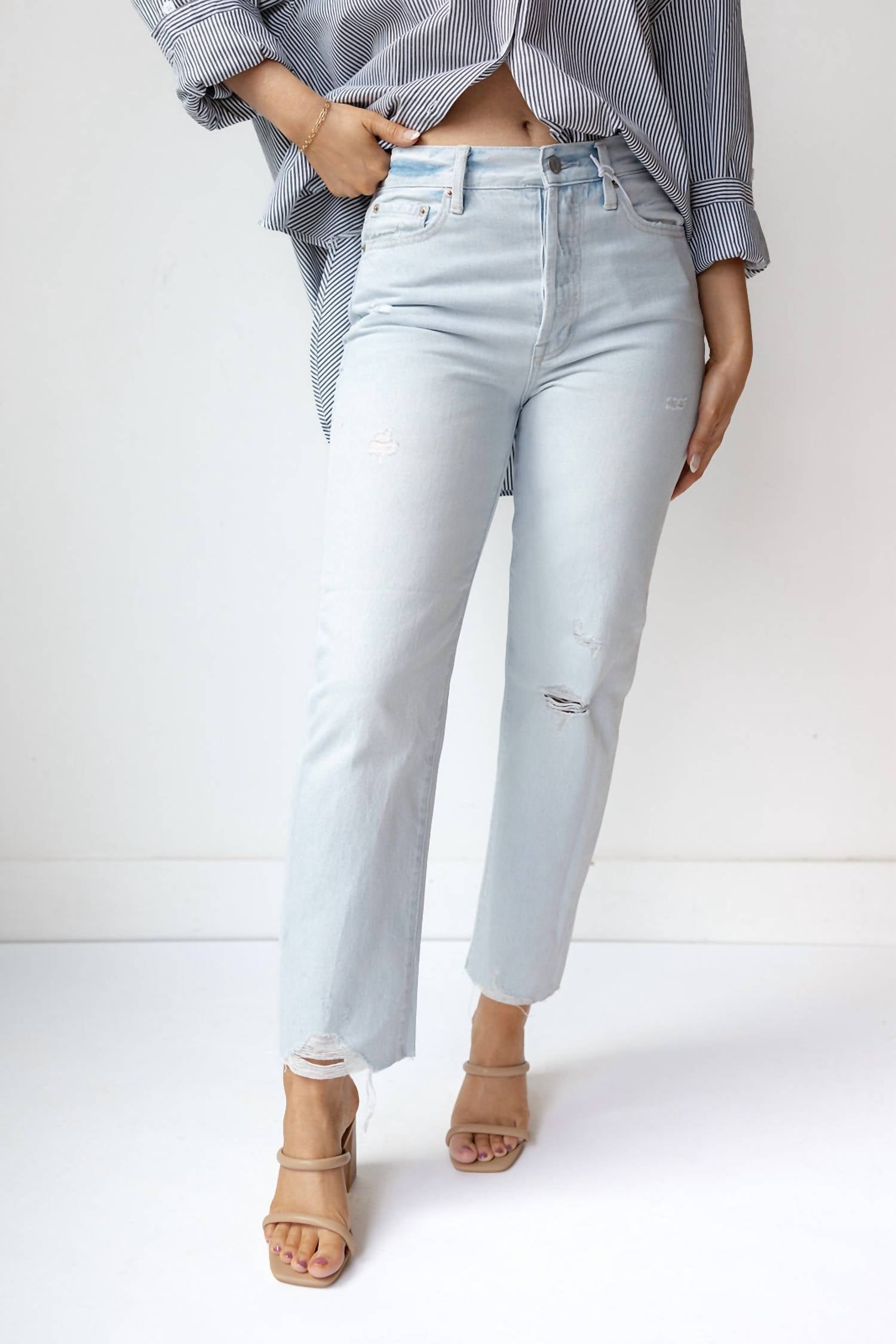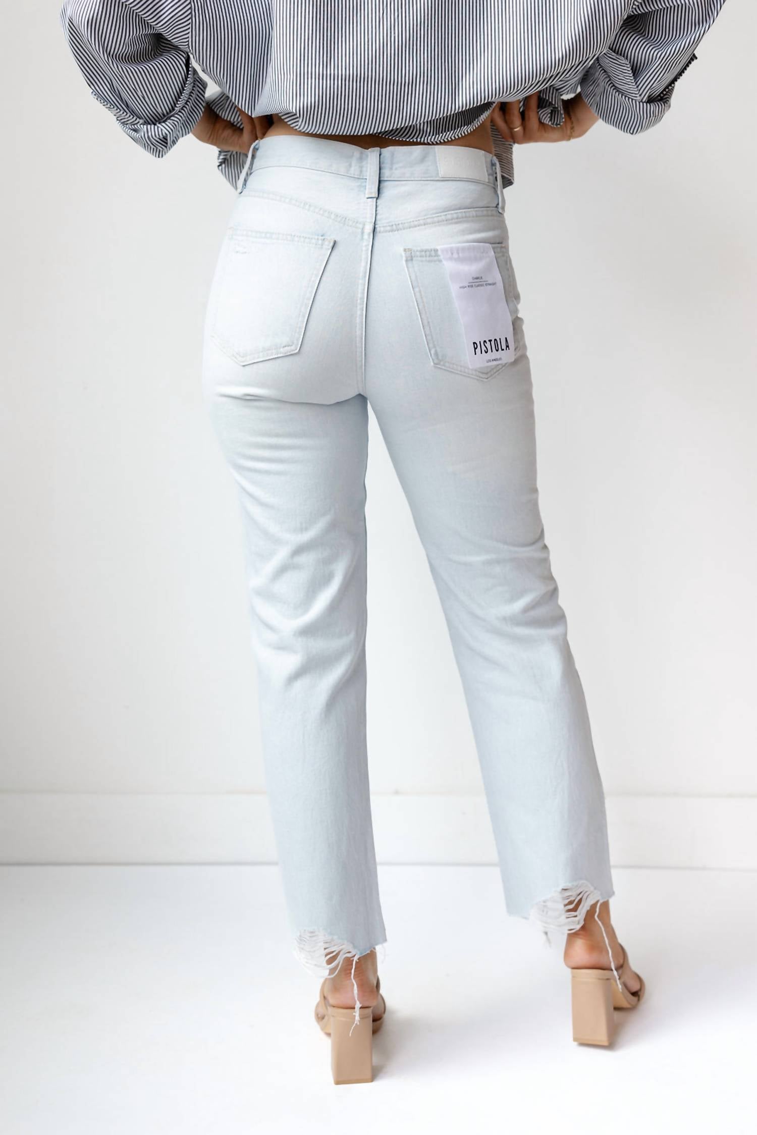 High-waist is here to stay and we especially love this style. Introducing the Charlie High Rise Jeans by PISTOLA in a destination distressed light wash, perfect for your everyday denim needs. Featuring a straight leg fit with slight distressing, these jeans offer a solid pattern with a stylish high rise. Made from 100% durable cotton, they boast a convenient zip closure and functional pockets. Care for these versatile jeans with hand wash and lay flat to dry instructions, ensuring longevity and sustained style. Miranda is wearing a size 26, and they run true to size with a 28" inseam.