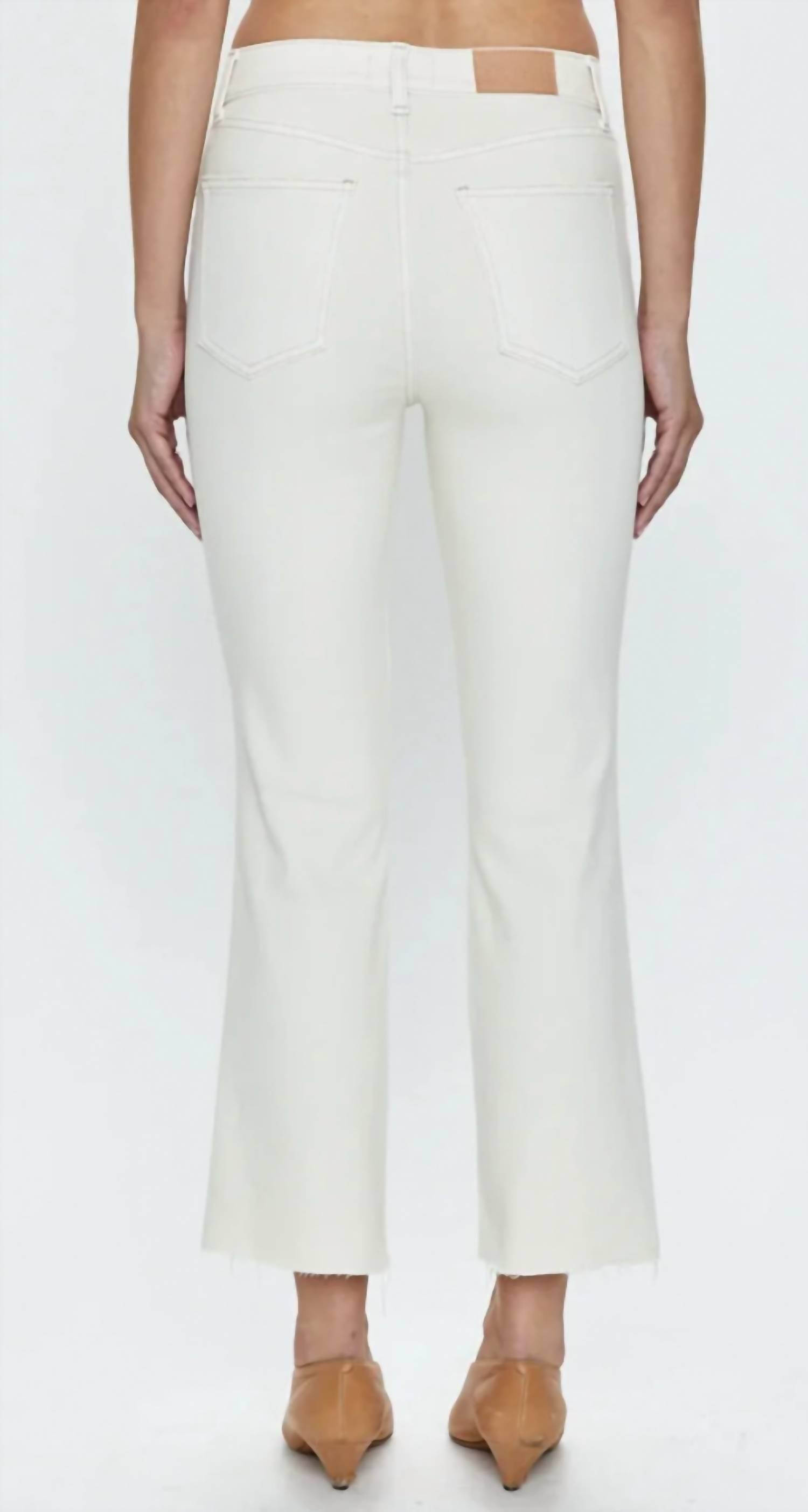 The perfect cropped jean for those transitional seasons. A pair you'll get endless wears out of. In a boot cut fit, it hugs you from the hips to knee and flares out at the calf for a proportional effect. Featuring a sandy white wash with contrast stitching, the high rise jean fits a polished, yet relaxed dress code. 67% Cotton / 9% Rayon / 22% Repreve / 2% Elastic Inseam: 27" /Rise: 10.5” /Leg Opening: 16" Model is 5’9” wearing size 26 Wash Cold Comfort Stretch