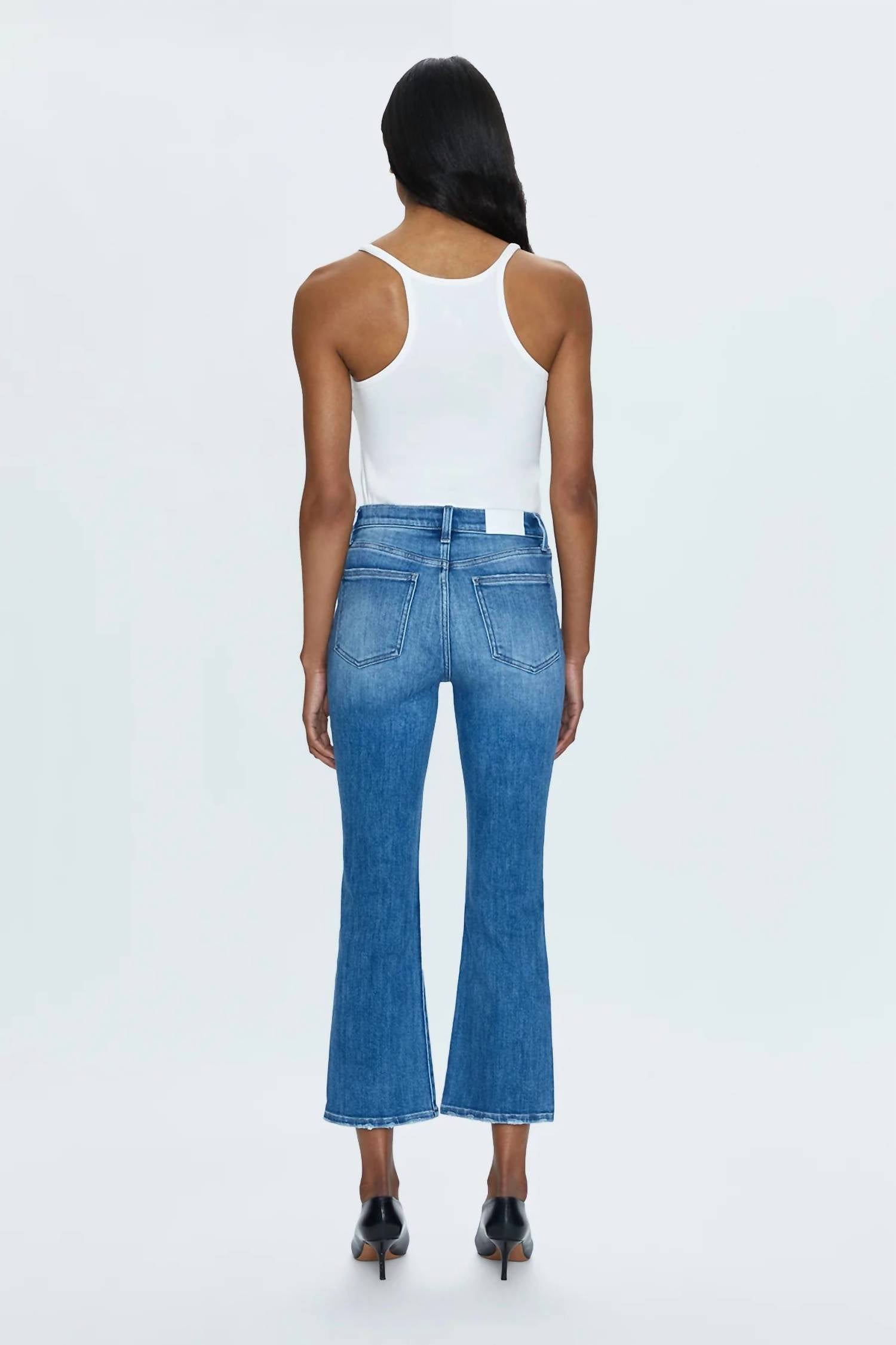 High-waist is here to stay and we especially love this style. Elevate your denim collection with the Lennon High Rise Crop Bootcut Jeans by PISTOLA, perfect for any streetwear enthusiast or vacation wardrobe. These jeans feature a relaxed fit with a solid bootcut leg, a flattering high-rise 11" waist, and a 27" cropped ankle hem. Crafted from a durable cotton blend (95% Cotton, 4% Polyester, 1% Elasterell) in a classic medium wash, they include a stylish shark bite hem and light distressing. Closure is secured with a convenient button and zip fly, complete with pockets for practicality. Care instructions include machine washing and tumble drying for easy maintenance.