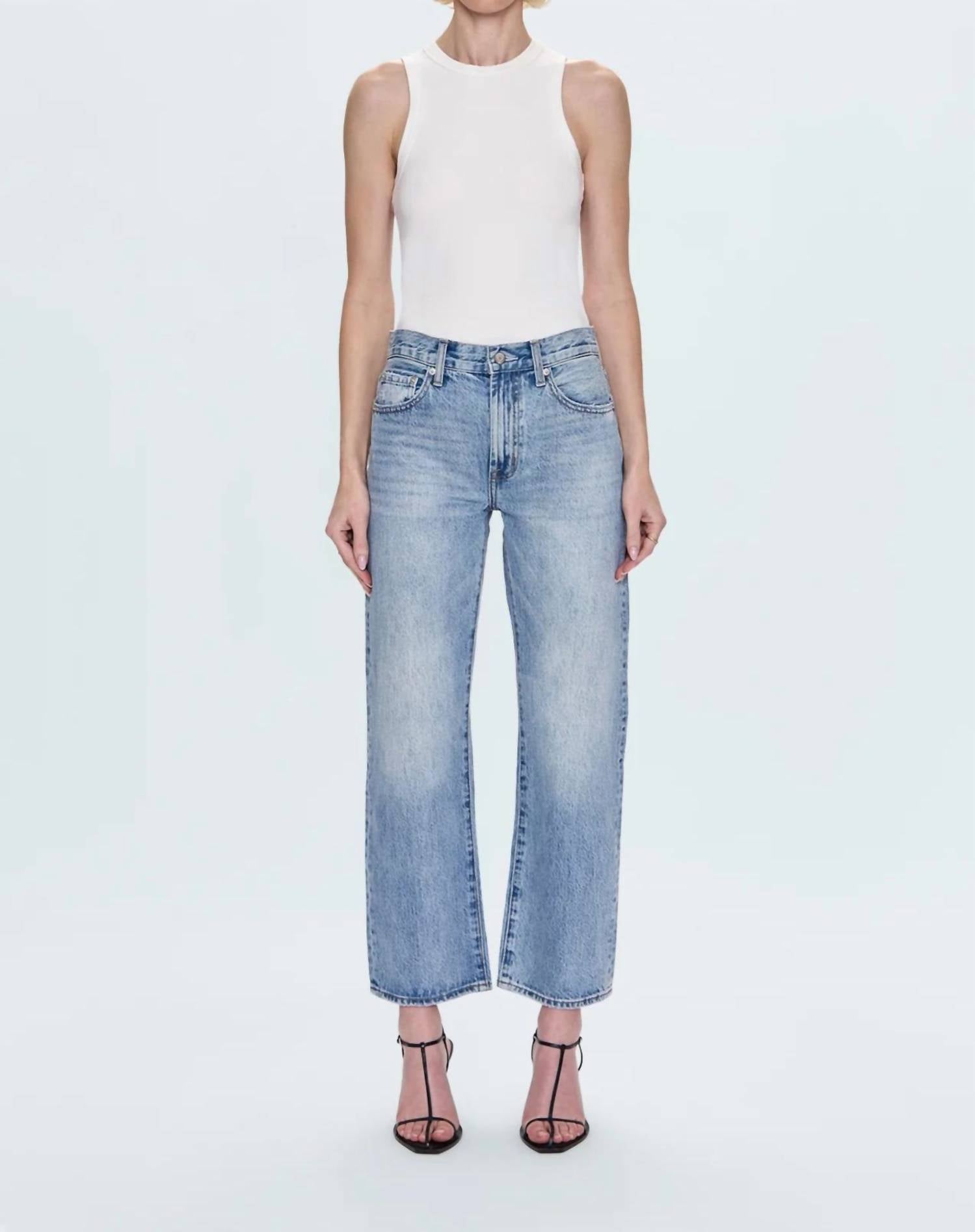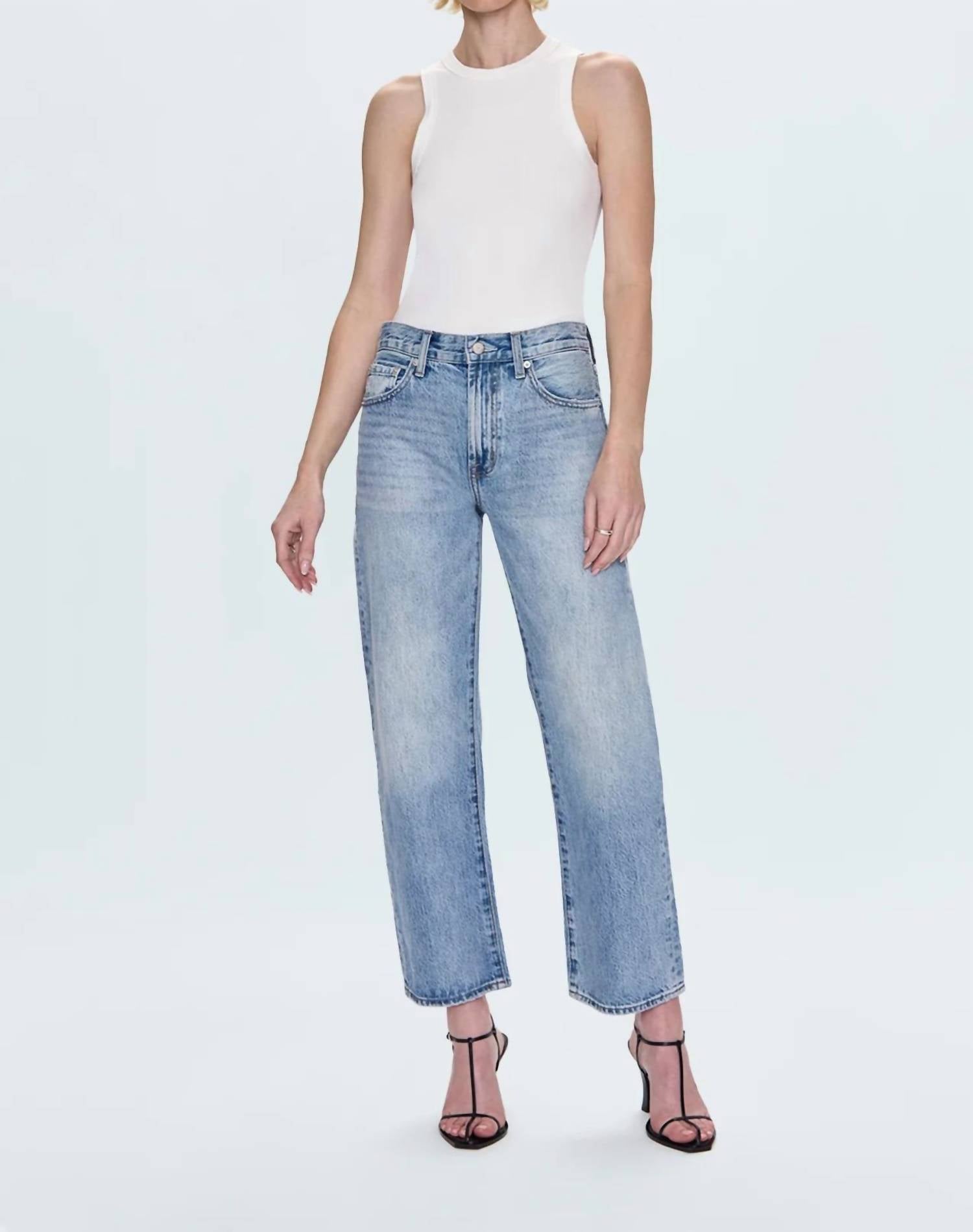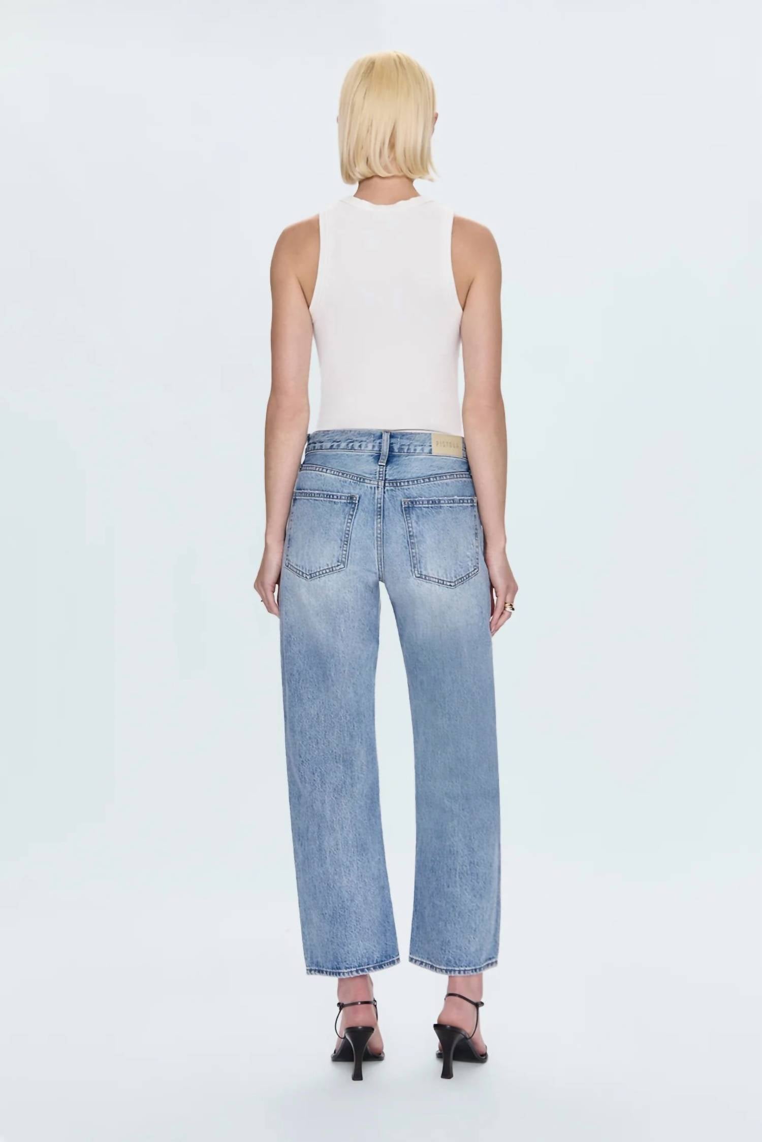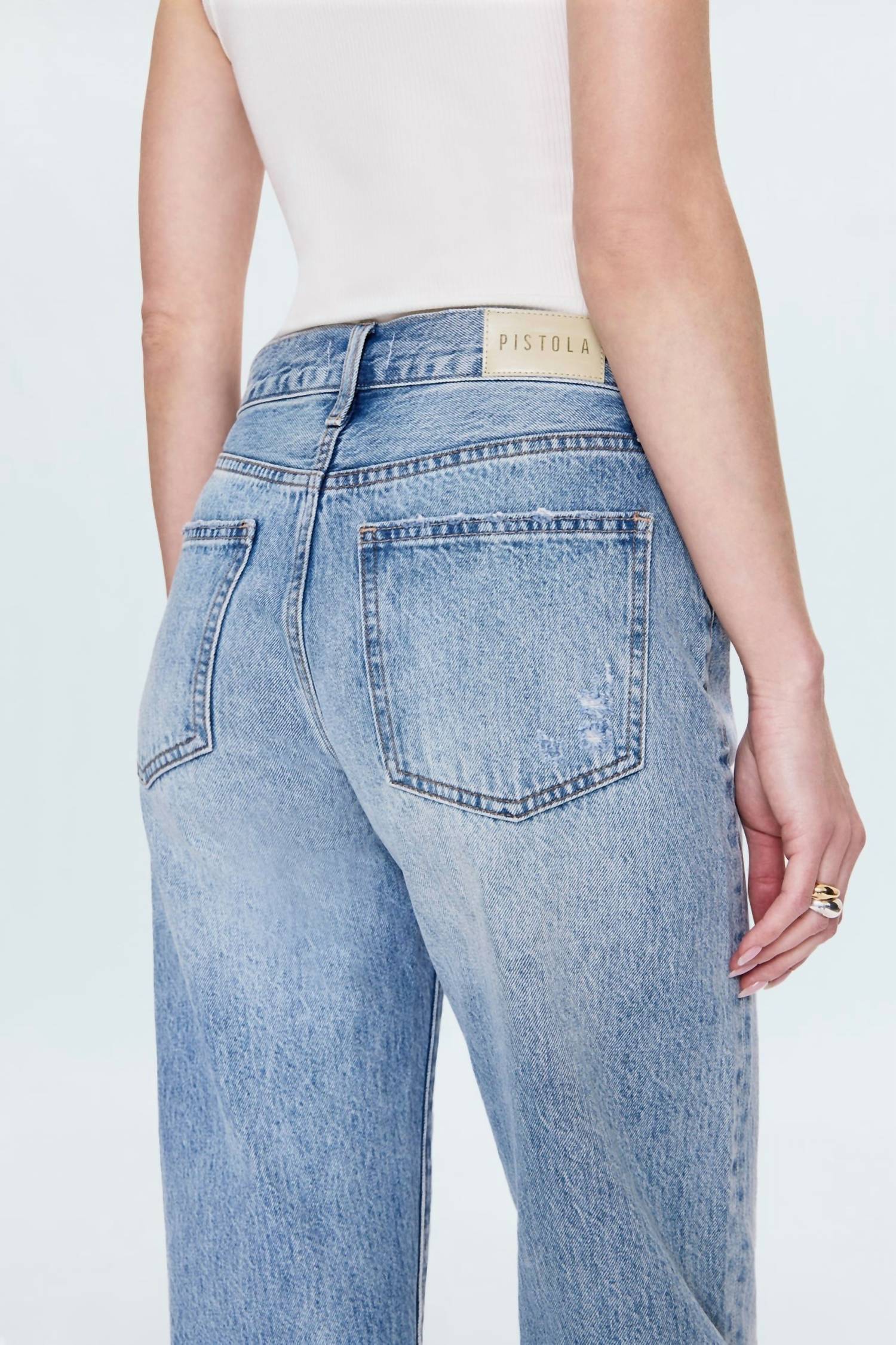 Discover the Lexi Mid Rise Bowed Straight Jeans by PISTOLA, your new go-to in denim. These ankle-length jeans feature a unique arched, barrel leg silhouette with a 10-inch mid-rise and a 29-inch inseam. Made from 100% cotton, they come in a light wash, Bowie, with lived-in fading around the knees and thighs. Closure: Zip fly. Care: Machine wash and tumble dry for easy care.