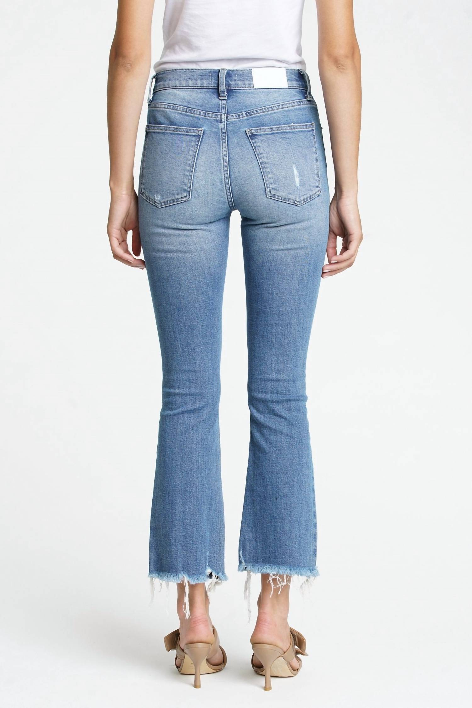 Introducing the Women's Lennon High Rise Cropped Bootcut Jeans by PISTOLA in the vibrant Zuma shade. These jeans feature a high-rise button closure design, creating a relaxed yet stylish fit suited for any occasion. Crafted from a cotton blend with a composition of 94% Cotton, 5% Polyester, and 1% Elastane, they promise comfort and durability. Closure: Button closure. Enjoy the playful shark bite hem and slight distressing on the thighs, complemented by a medium wash ideal for spring. Measurements include a 10.5" rise, 27" inseam. Care: Machine wash cold, lay flat to dry.