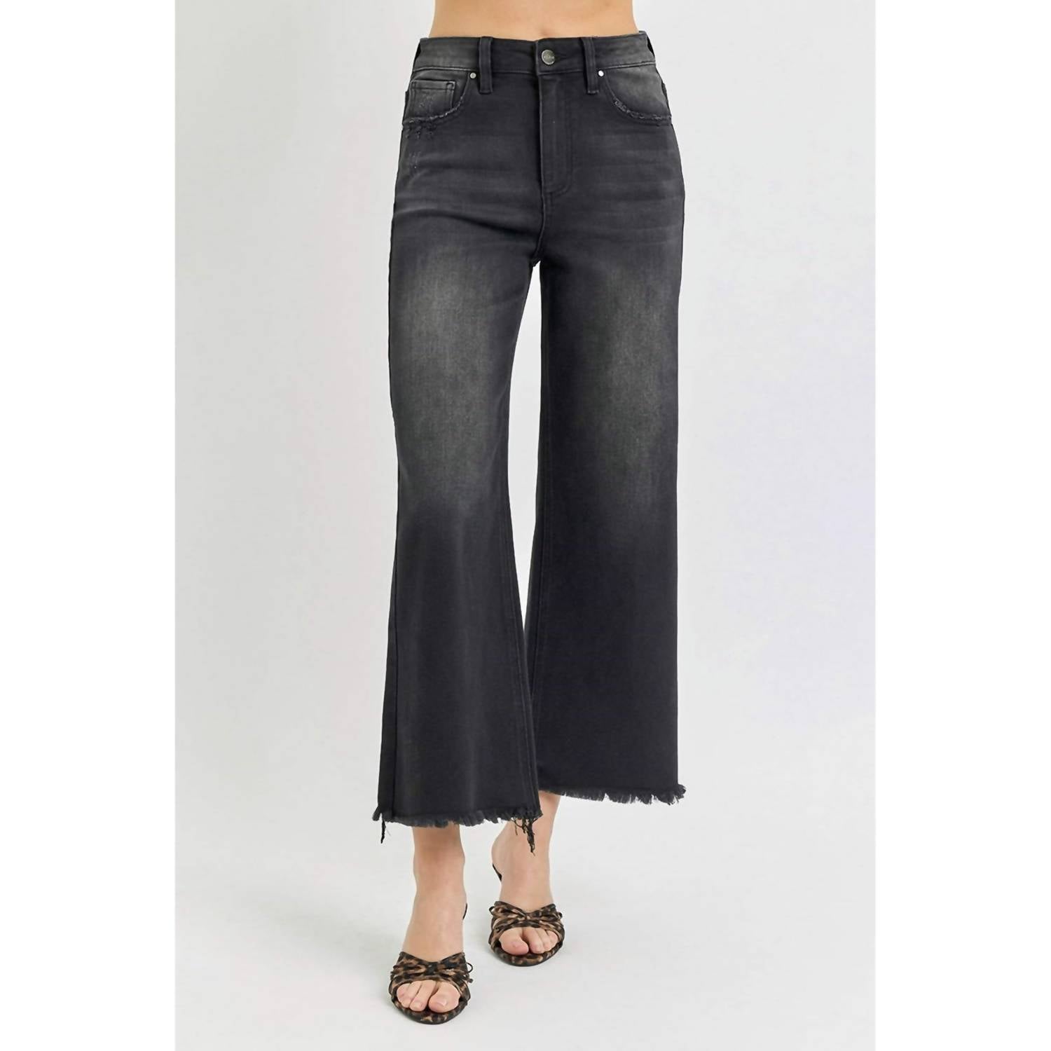 Slightly flared pants are all the rage right now and these are no exception. Pair these with your favorite tee for a more casual look, or with your favorite button-up blouse for an evening out. Introducing the Women's High Rise Frayed Ankle Wide Jeans by RISEN, an on-trend piece for the summer streetwear wardrobe. Crafted from cotton, these jeans feature a wide leg style with a classic fit, textured pattern, and a dark wash finish. The design is accentuated by frayed ankles and a practical zip closure, making them perfect for vacation days. Pockets are included for added convenience, although specific care instructions are not provided.
