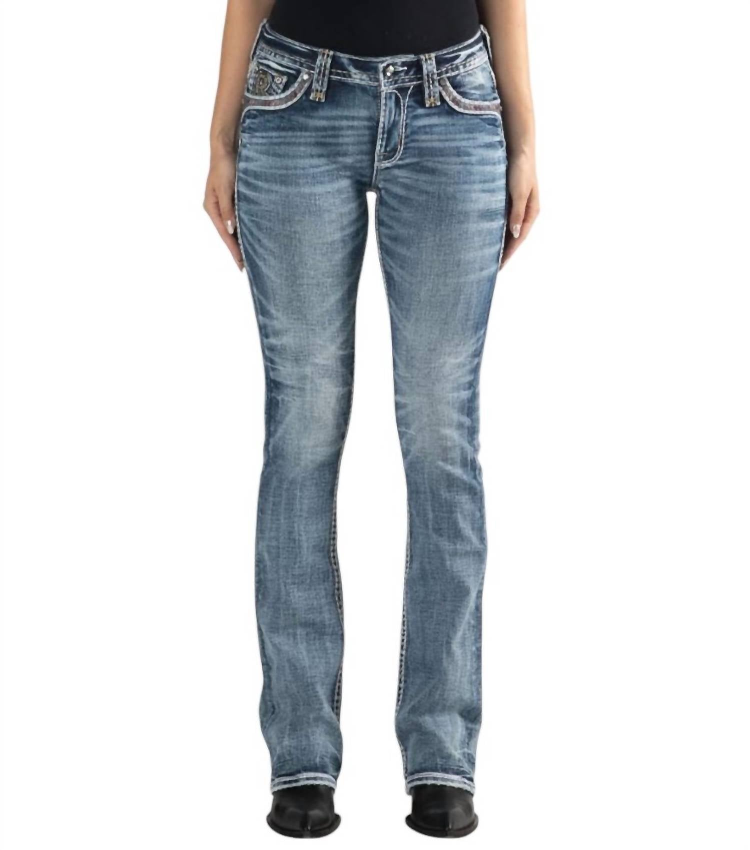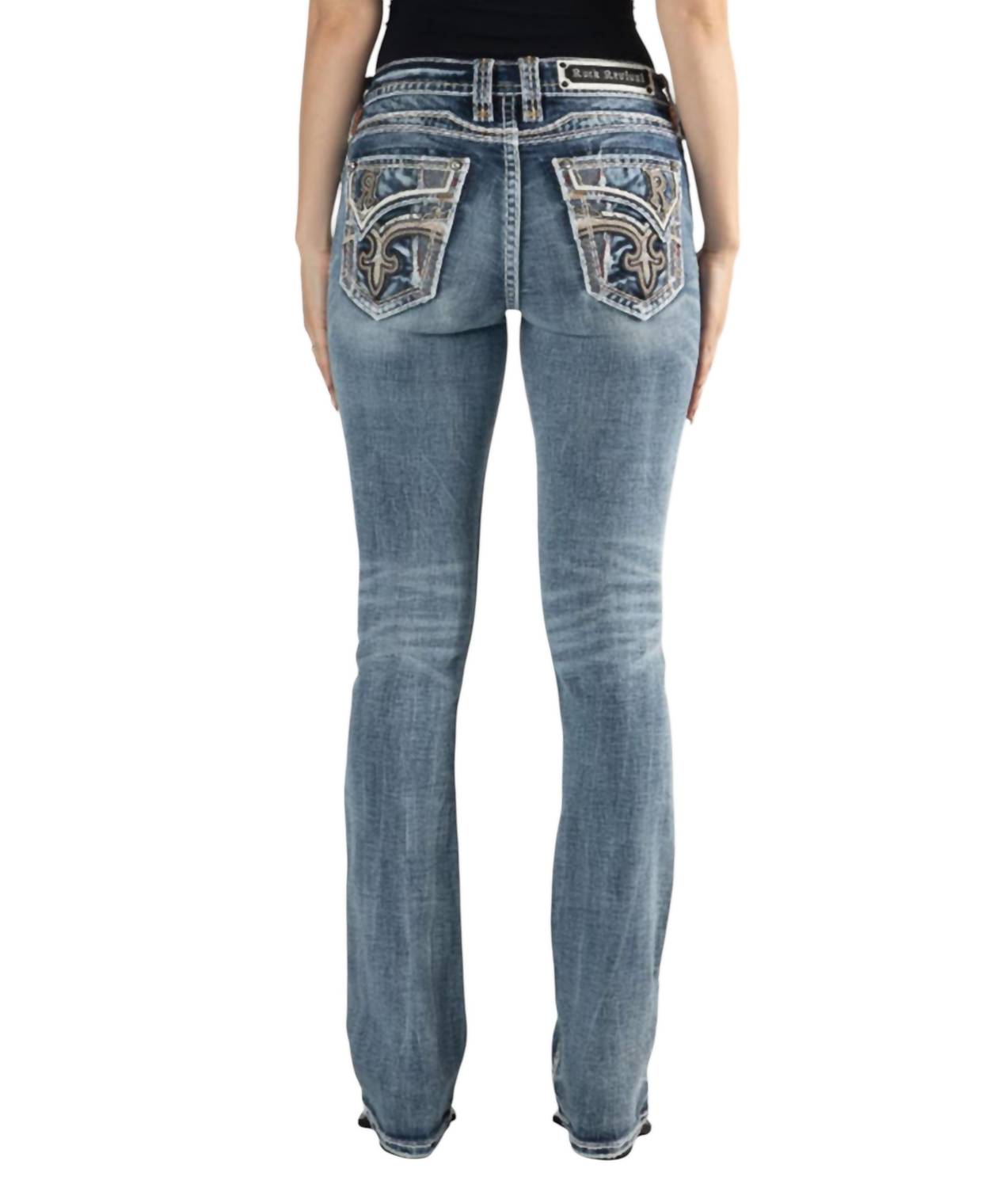 If you're looking for boot-cut, this is the jean for you. Introducing the Rock Revival Women's Jiana Boot Cut Jean, a stylish pair in vintage indigo perfect for enhancing your wardrobe. These jeans feature a 32-inch inseam and a low-rise, bootcut leg style with a flattering fit. Crafted from a high-quality blend of 99% cotton and 1% elastane denim, they offer both comfort and a flattering silhouette. With elegant pattern details and a unique inverted fleur de lis design on the back pockets, these jeans are both chic and practical. Closure: Zip Closure. Care Instructions: Machine wash and tumble dry.