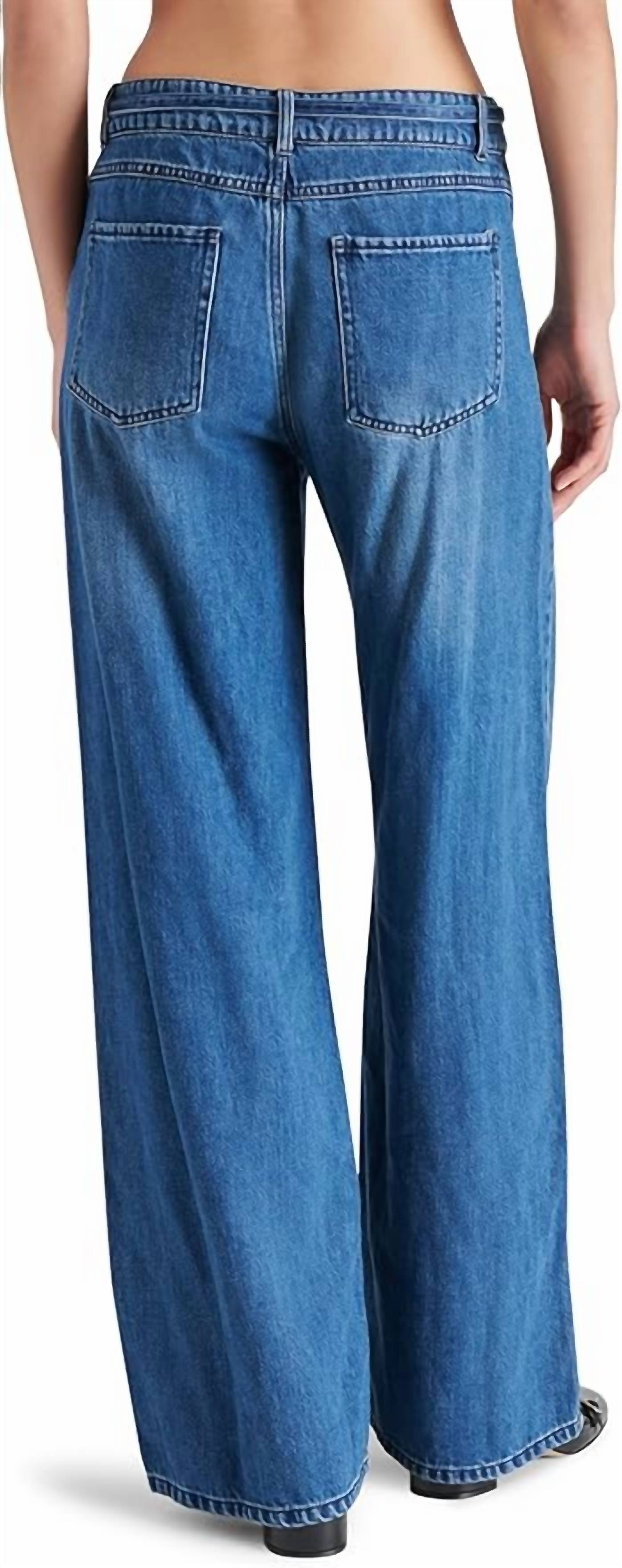 Pair these wide leg jeans with mules, slides or your favorite strappy sandals. Introducing the Serenity Wide Leg Jeans by STEVE MADDEN, designed for effortless style and comfort in a medium blue hue that's perfect for spring streetwear. With a composition of 80% cotton, 15% polyester, and 5% rayon, these relaxed-fit jeans feature a wide leg and mid-rise waist for a flattering silhouette. The solid pattern and button closure add a sleek finish, while the conveniently placed pockets enhance practicality. For best results, hand wash and lay flat to dry to maintain its quality, making them an ideal choice for a vacation-ready wardrobe.