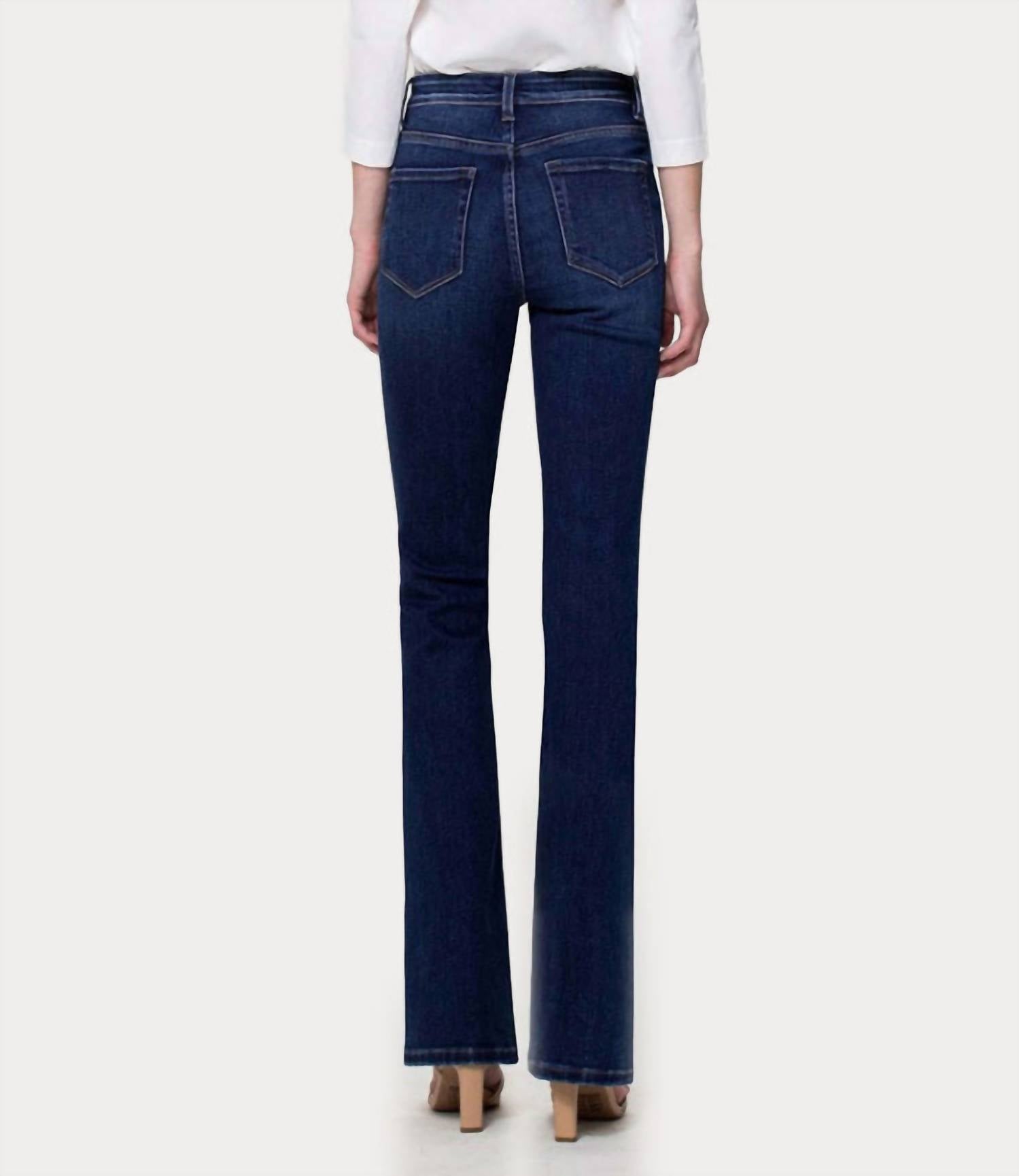 Offer a classic fit with a modern edge, perfect for game day or any streetwear ensemble. Feature a comfortable stretch denim composition with 65% cotton, 21% polyester, 12% viscose, and 2% spandex. Designed with a high rise waist and a full-length bootcut leg. Ensure a flattering fit with a 12" rise, 32" inseam, and a leg opening of 19 1/2". Complete with a button closure. Machine washable fabric suitable for tumble drying.