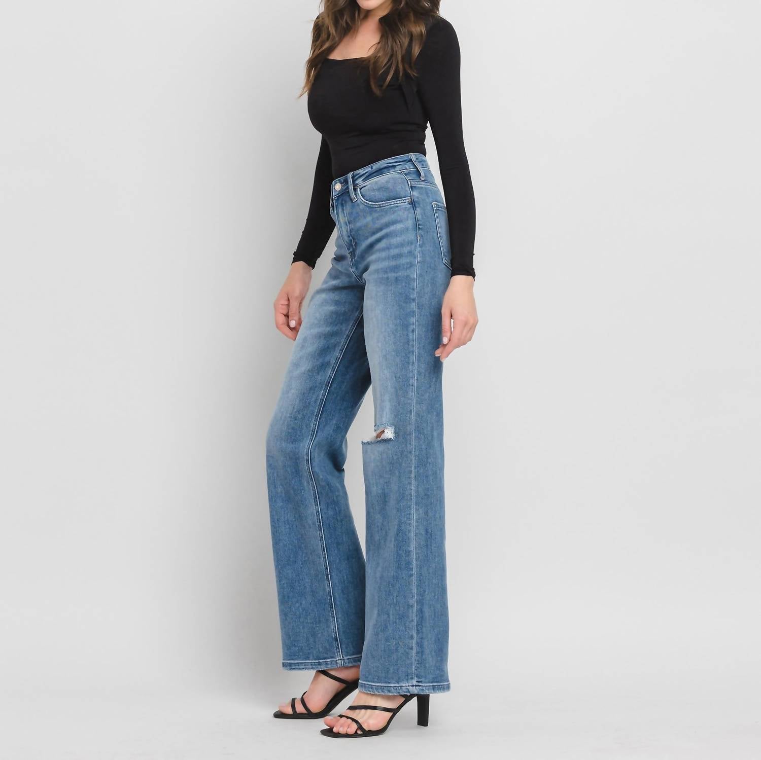 Pair these wide leg jeans with mules, slides or your favorite strappy sandals. Introducing the Leslie Super High Rise 90's Vintage Flare Jeans by VERVET BY FLYING MONKEY, a nostalgic nod to retro style in a chic Crush hue. These jeans feature a super high rise and a flared leg style, designed in a comfortable stretch denim composed of 99% Cotton and 1% Spandex. With a zip closure and full-length cut, they boast a vintage-inspired design complete with distressed details, and a finished hem. Care for these jeans by machine washing cold with like colors and laying flat to dry, showcasing a medium wash ideal for any occasion. Dimensions: Approx. Rise 11", Inseam 34", Leg Opening 20".