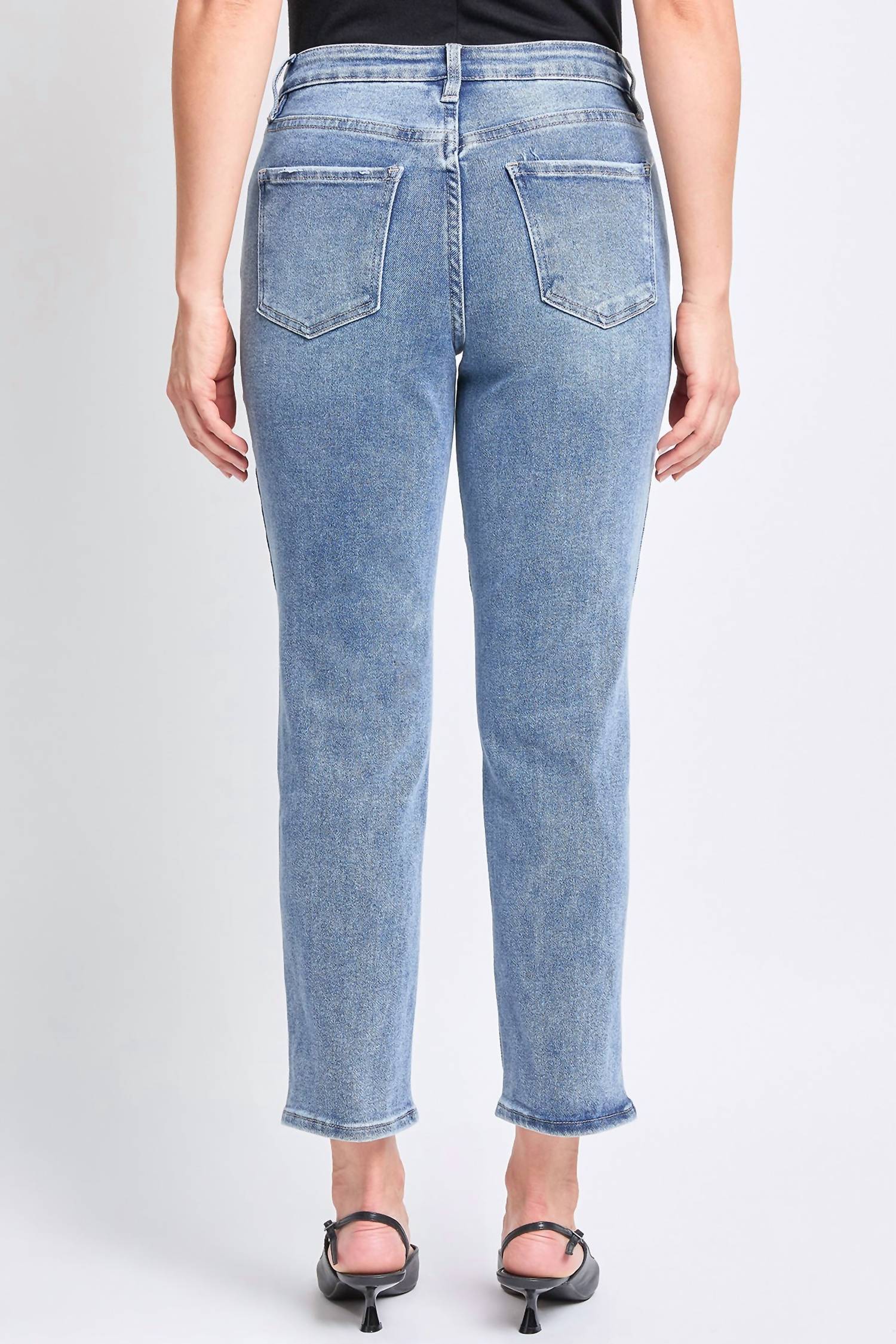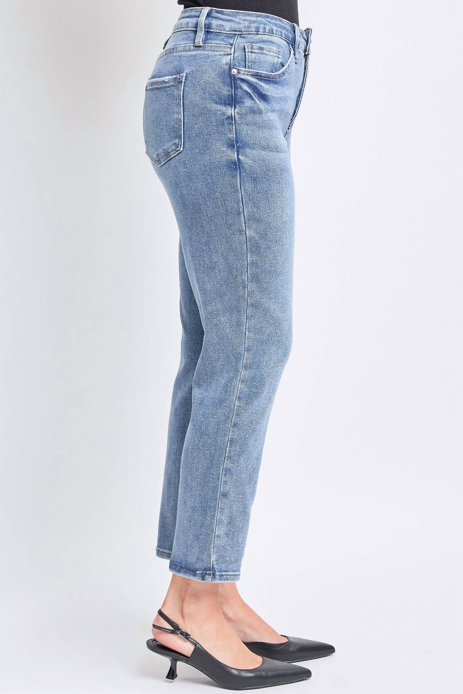 These high-rise slim straight jeans are crafted from midweight stretch denim for a flattering, comfortable fit. Designed with classic five-pocket styling and a front zip fly with button closure, they feature built-in front panels and a specially constructed waistline for added tummy control. Versatile and timeless, they pair effortlessly with everything from casual tees and sneakers to polished button-ups and mules.