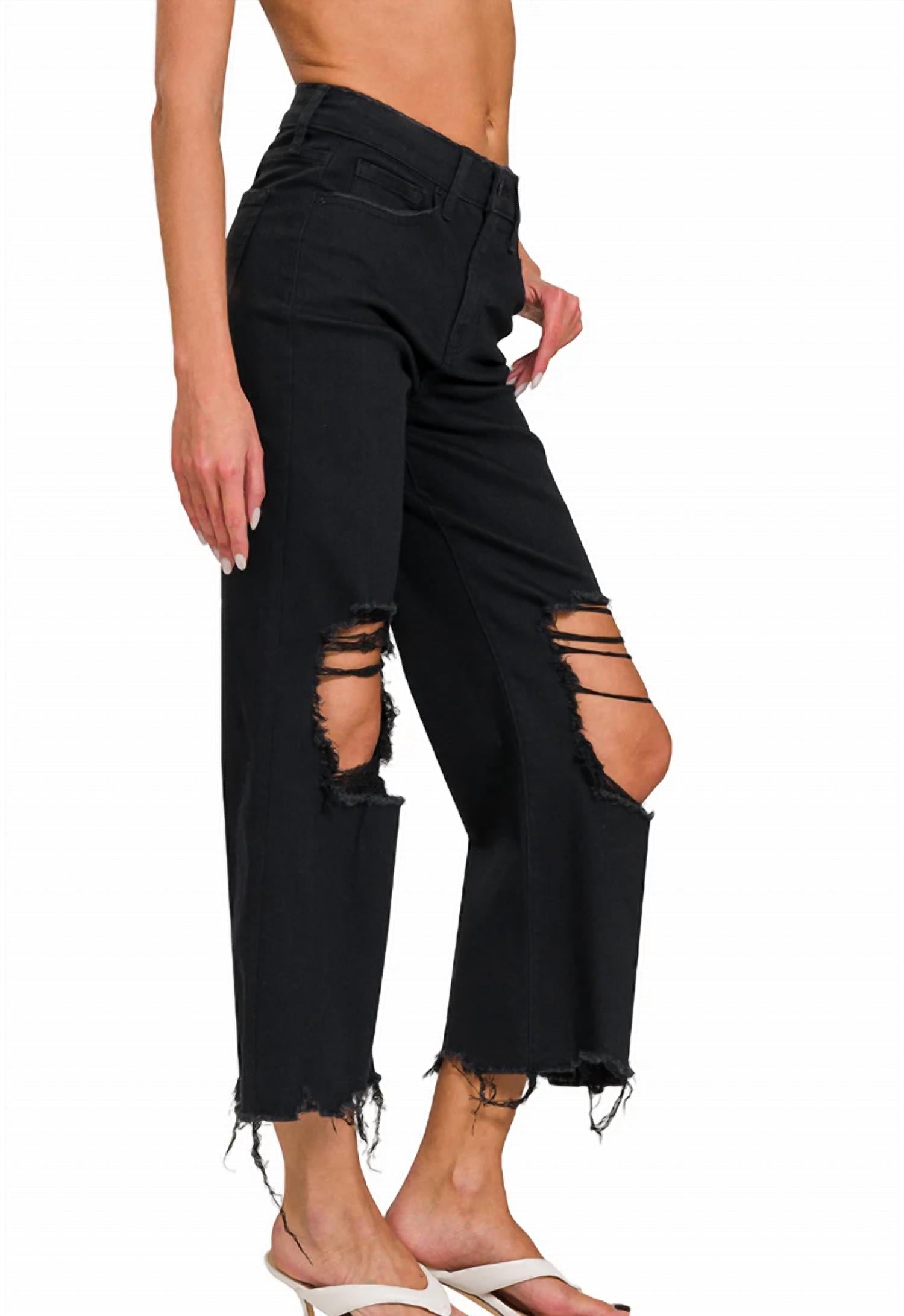 A flattering silhouette that's suprisingly versatile. Elevate your style with the Blackout Distressed Jeans by ZENANA, expertly blending grunge with street-chic flair. Featuring a solid black cotton blend, these jeans offer a relaxed straight-leg fit with bold knee distressing and a raw hem for a laid-back yet fearless look. Composition: 71% Cotton, 26% Polyester, 3% Spandex. Closure: Button Closure. Ideal for spring vacations, these jeans are the perfect addition to any minimalist wardrobe.