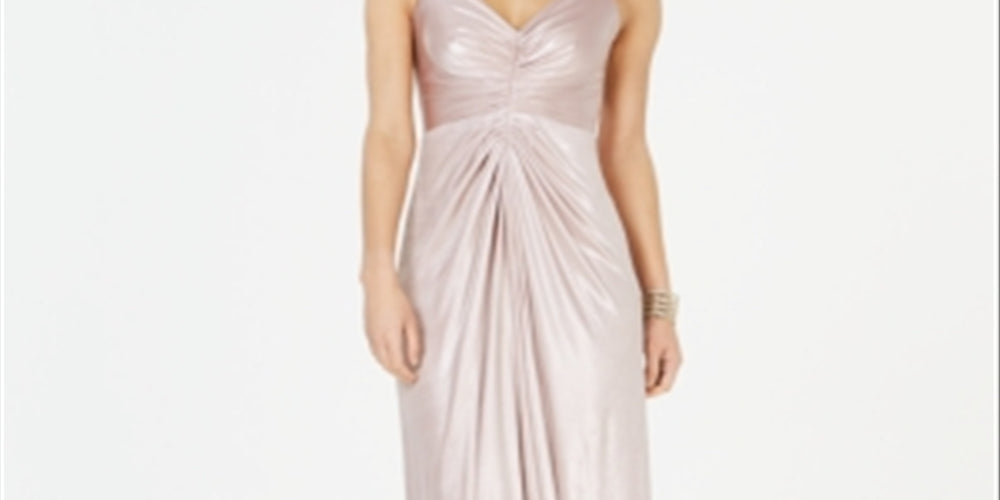 Total bridesmaid win; Adrianna Papell's liquidy metallic gown| knotted and ruched for a form-fitting drape.| Approx. 50-3/8 long from center back to hem. Length is based on size 4 and varies 1/4 between sizes| V-neck; Gown silhouette| Hidden back zipper with hook-and-eye closure| Knotted front detail; ruching; allover metallic sheen