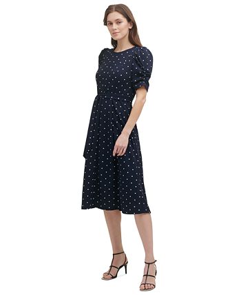 DKNY Women's Polka Dot Ruched Sleeve Midi Dress Blue Size 4Petite