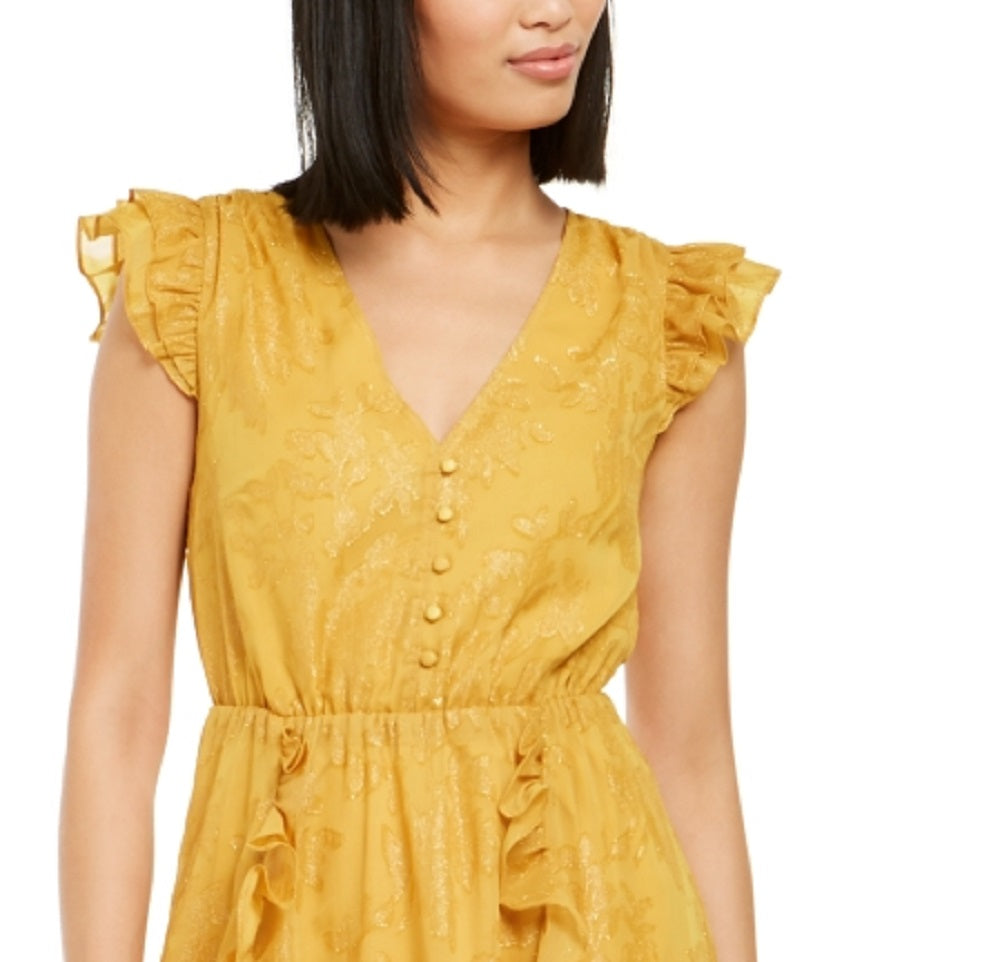 Approx. 42 long from center back neck to hem|Designed to fit and flatter 5'4 and under frame|V-neck; A-line silhouette|Front covered button closures|Flutter sleeves|Ruffle trim at skirt; burnout-print fabric; handkerchief hem