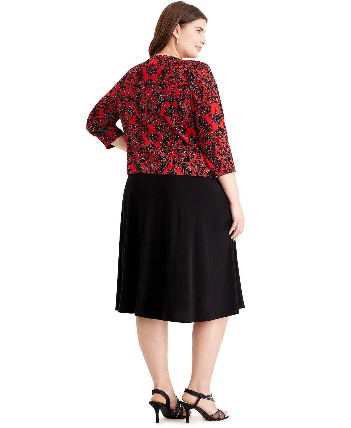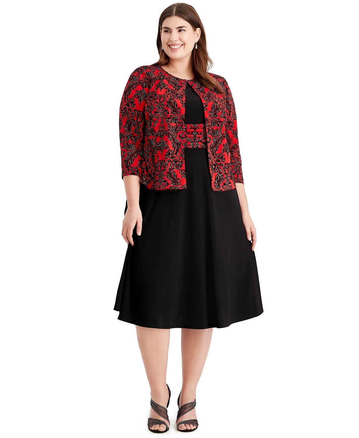 Approx. 44" long from center back neck to hem. Length is based on size 14W and varies 1/4" between sizes|Jacket: approx. length: 22"; hook-and-eye closure; 3/4-sleeves; shoulder pads|Round neckline; Midi silhouette|Hidden back zipper closure|Printed ruched waist