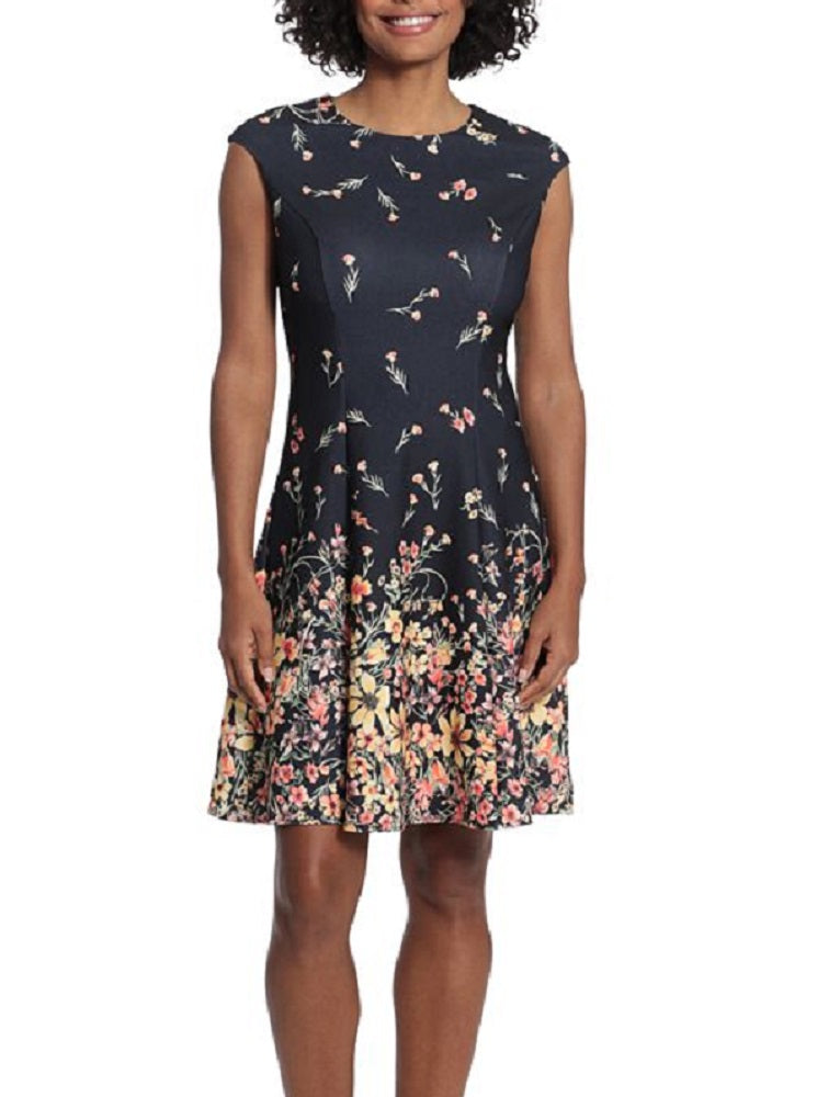 A structured silhouette and fresh florals combine on this brunch-perfect dress by London Times. | Fitted through the chest and waist; flared and flowing skirt| Back zipper closure| Scuba crepe; Stretchy and supportive| Imported| Unlined|