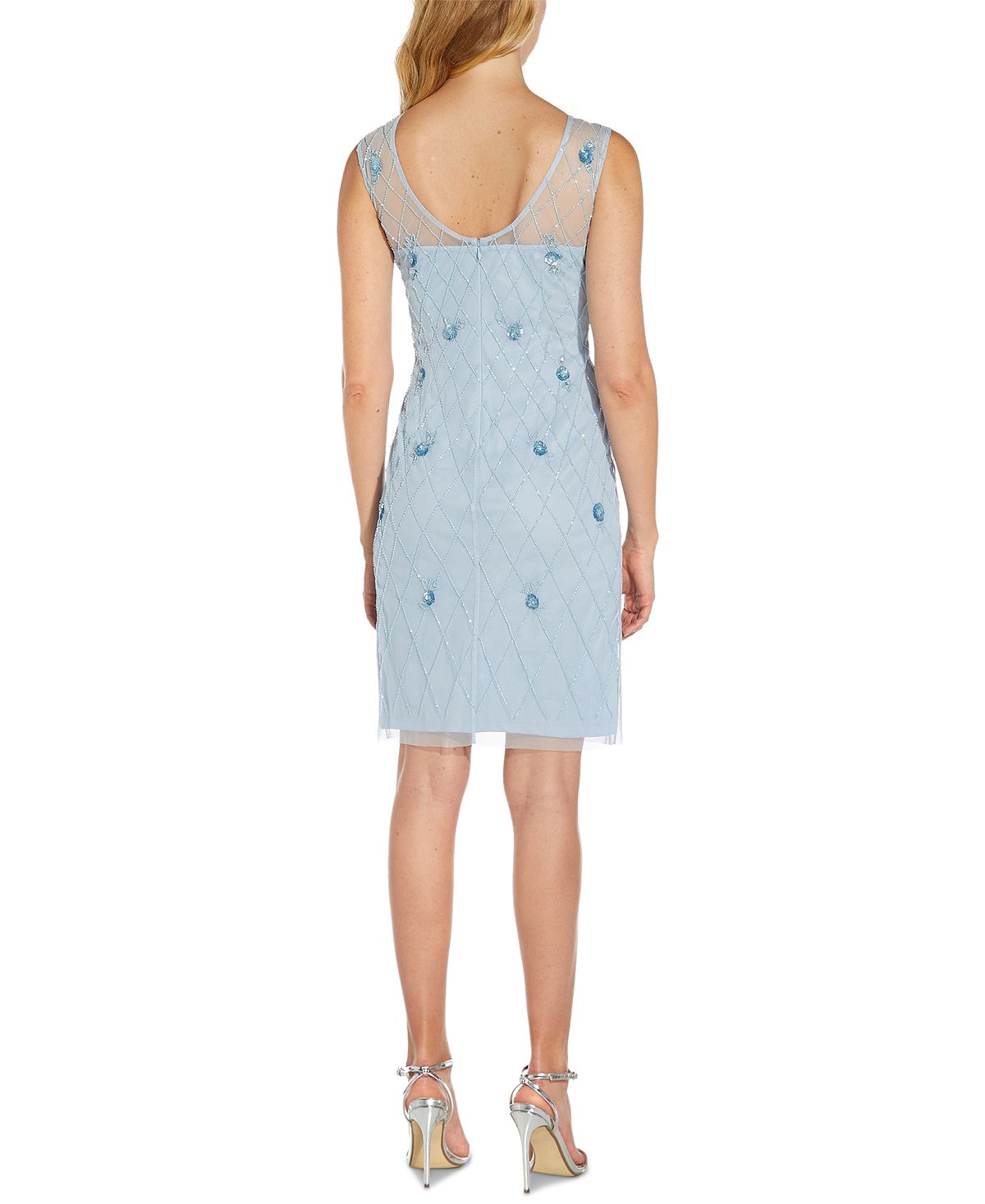 Say cheers to the perfect party dress. This shimmery sheath by Adrianna Papell turns heads with its sheer details and hints of sparkle.| Approx. 39 long from high point shoulder to hem. Length varies 1/4 between sizes| Tailored fit through the chest| waist| and hips; sits close to the body| Boat neckline; Sheath silhouette| Back zipper closure