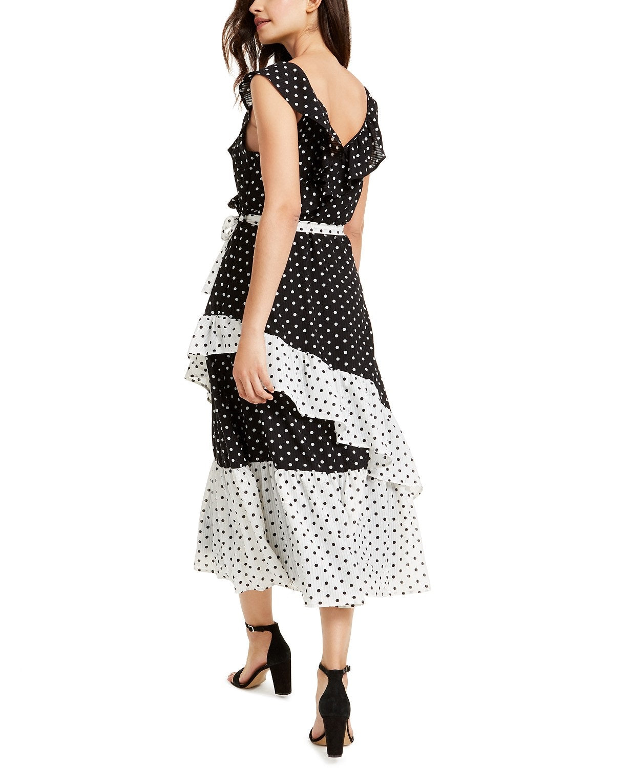 Approx. model height is 5'10" and she is wearing a size small|Surplice neckline; Faux-wrap maxi silhouette|Side zipper with hook-and-eye closure|Ruffled at neckline, sleeves and colorblocked hem; tie at waist|Polyester; lining: polyester|Machine washable|Imported