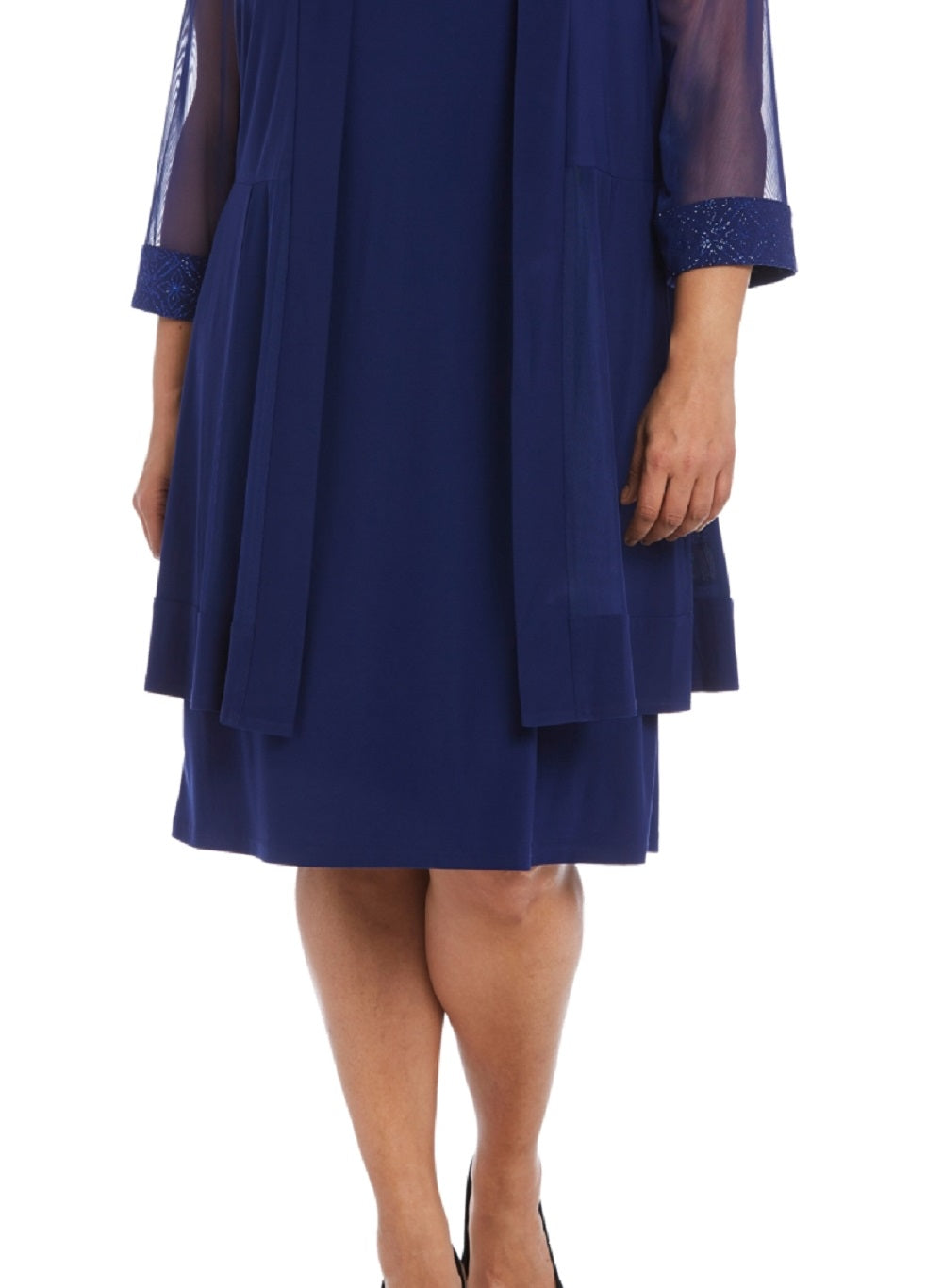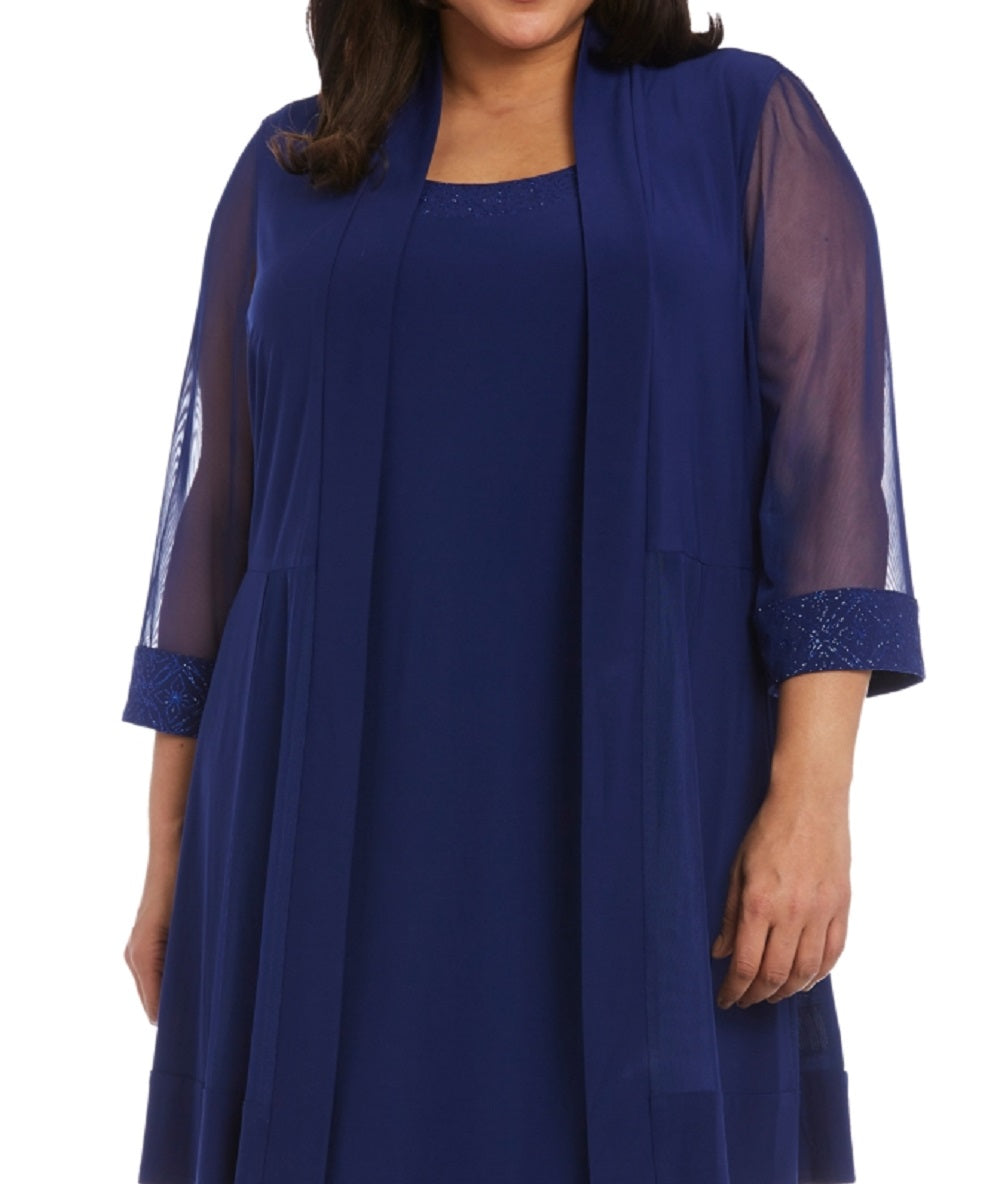 Part shimmer| part sheer| completely chic; this sleek plus size dress and jacket set from R & M Richards is embellished with elegance.| Approx. 37 long from center back neck to hem. Length is based on size 18W and varies 1/4 between sizes| Removable jacket; open front| sheer sleeves with embellished cuffs; sheer and solid panels below waistline seam