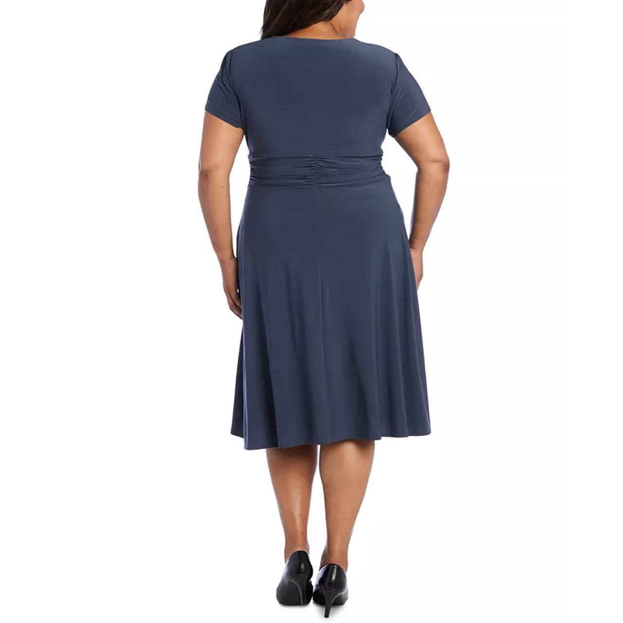 Approx. 42" long from center back neck to hem. Length is based on size 18W and varies 1/4" between sizes|Surplice neckline|Pullover styling|Ruched waist with rhinestone accent; draped faux-wrap skirt|Polyester/spandex; lining: polyester|Hand wash